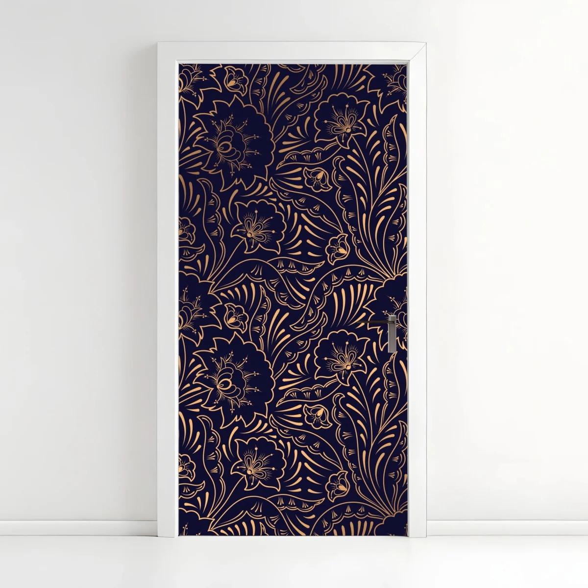 Naklejka na drzwi Złoty kwiatowy ornament na granatowym tle