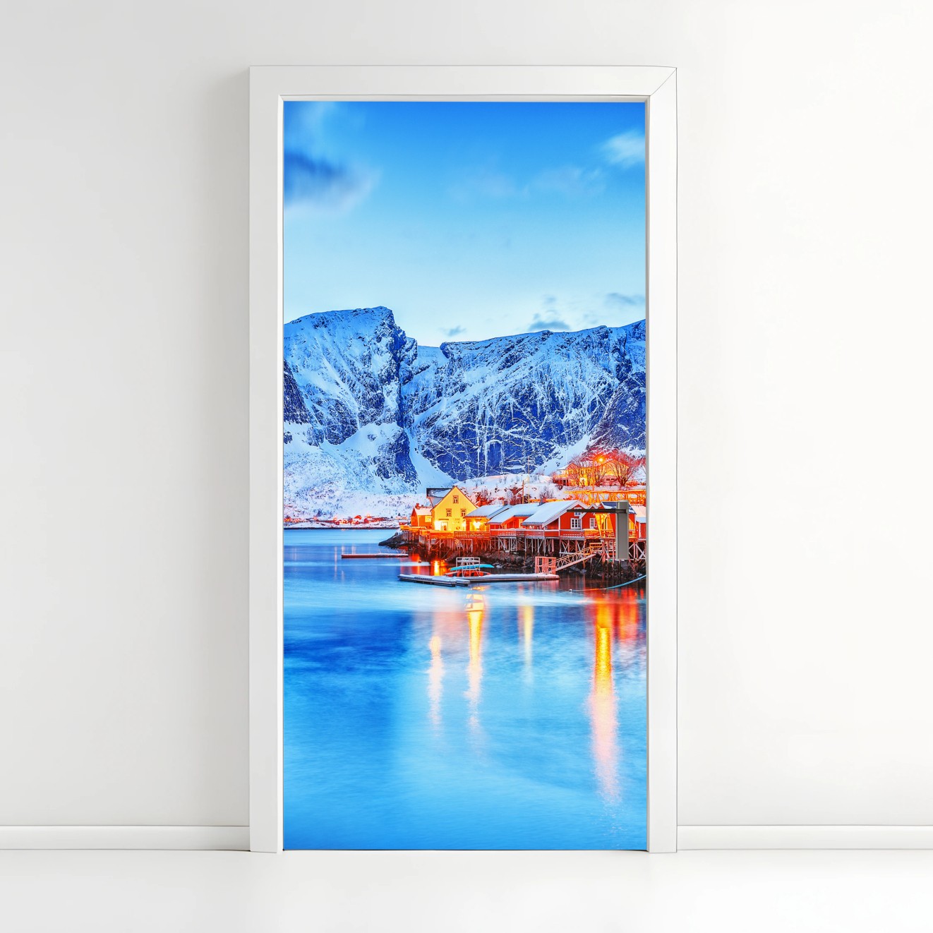 Naklejka na drzwi Zaśnieżona nadmorska wioska u stóp gór