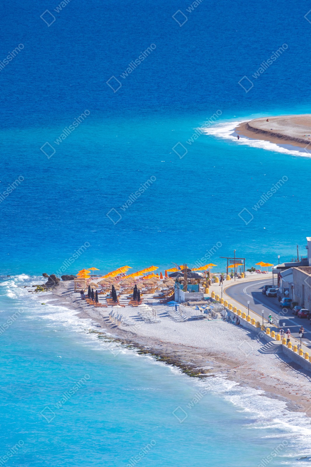 Wprowadź intensywne błękity Rodos do wnętrza dzięki temu spokojnemu obrazowi wybrzeża z turkusową wodą i słonecznymi parasolami.