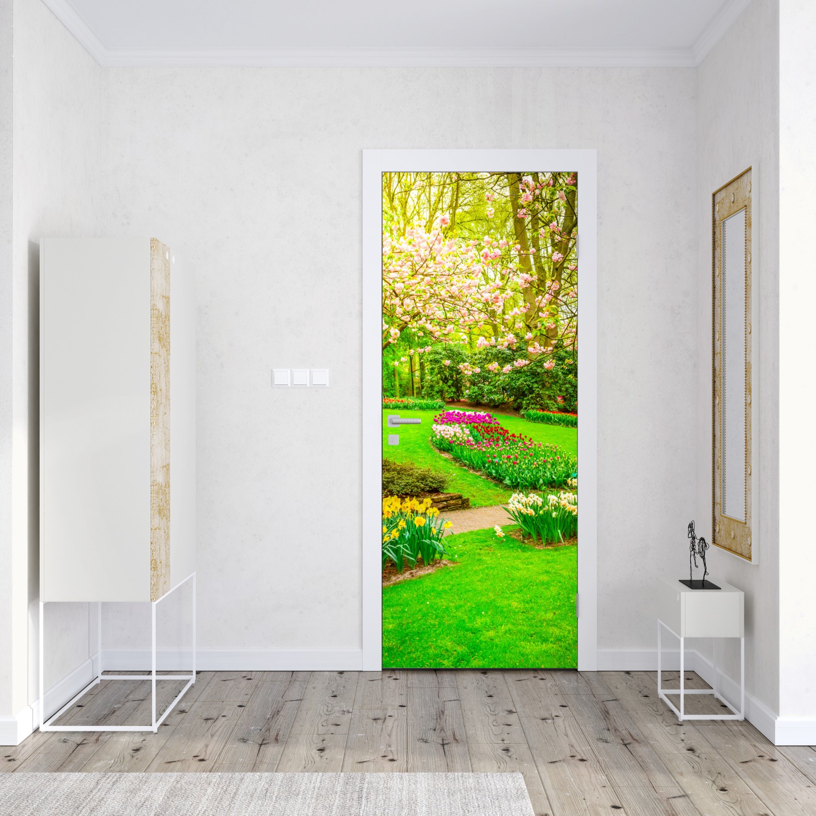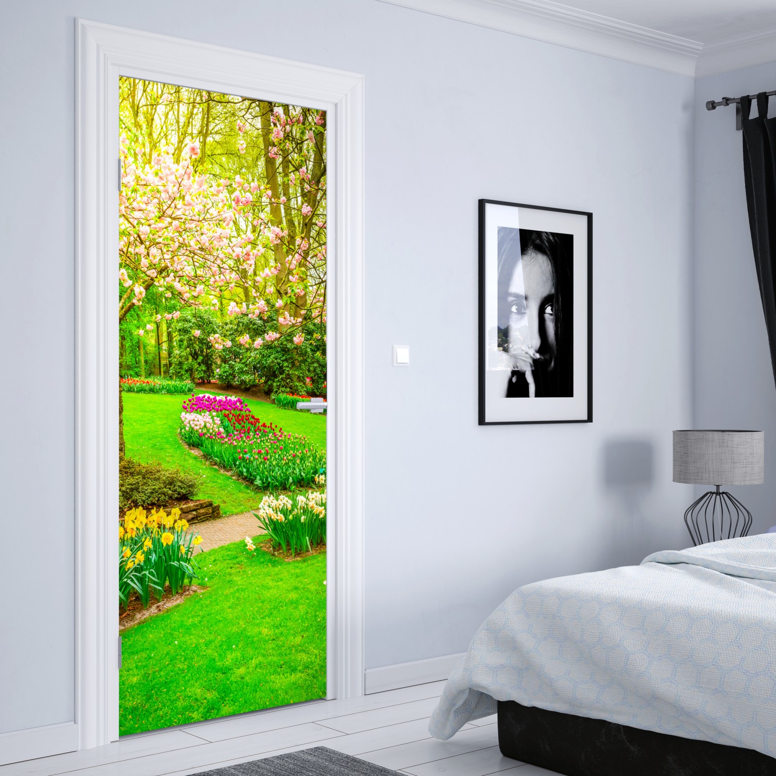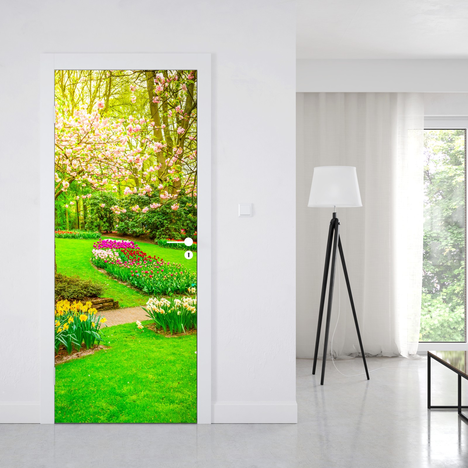 Naklejka na drzwi Wiosenny ogród w rozkwicie: tulipany i kwiat wiśni