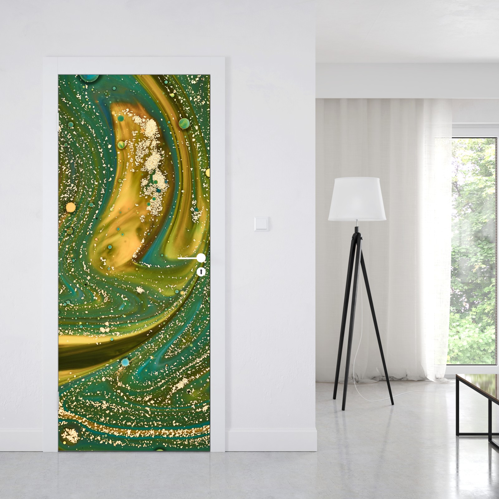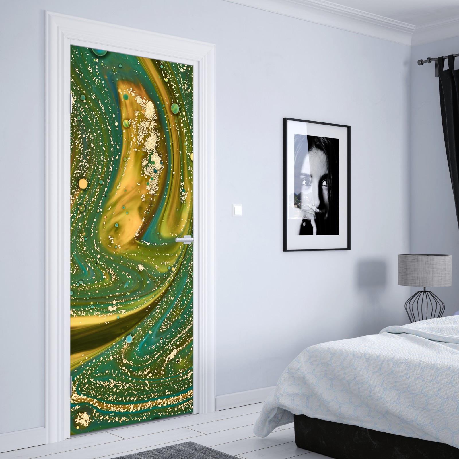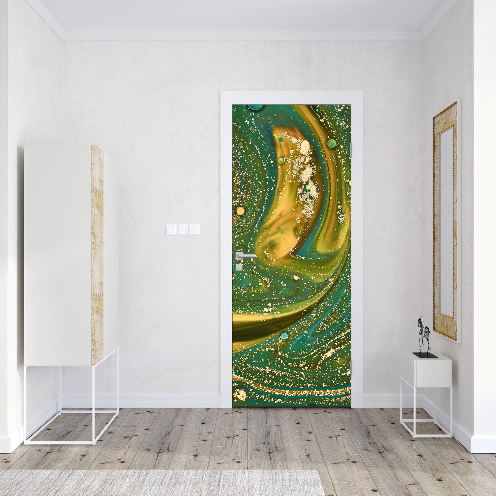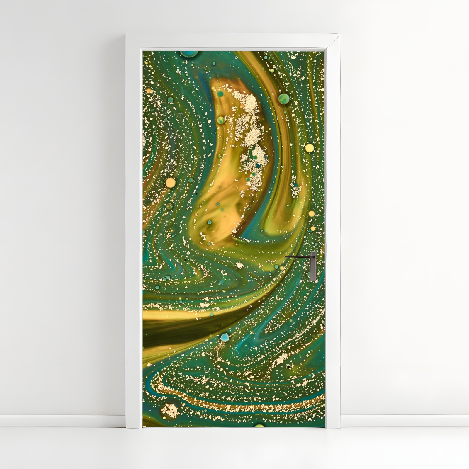 Naklejka na drzwi Zielono-złota płynna marmurkowa grafika