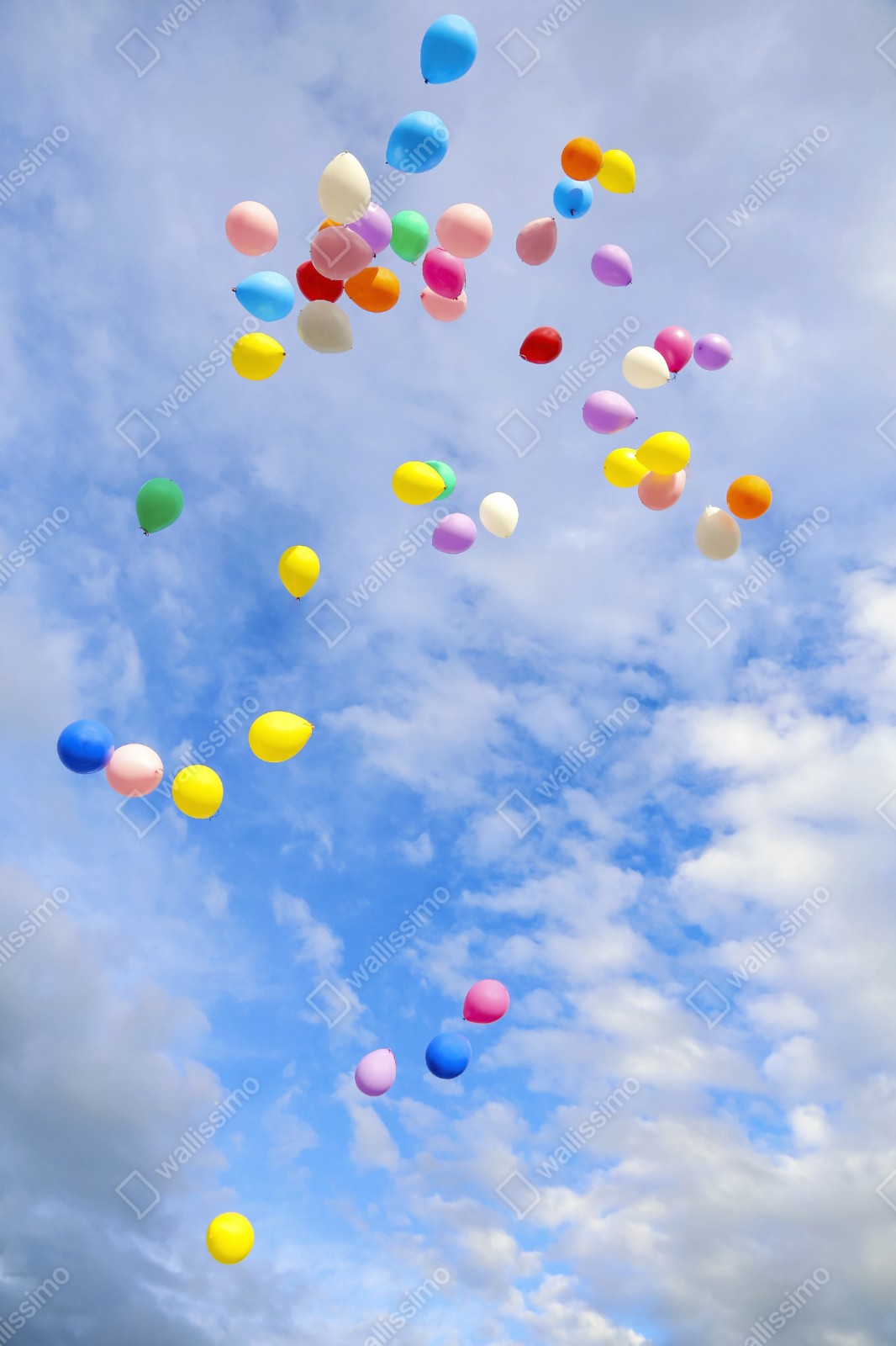 Dodaj radosnego koloru do wnętrza dzięki barwnym balonom unoszącym się na tle błękitnego nieba, idealne do stworzenia przyjaznej atmosfery.