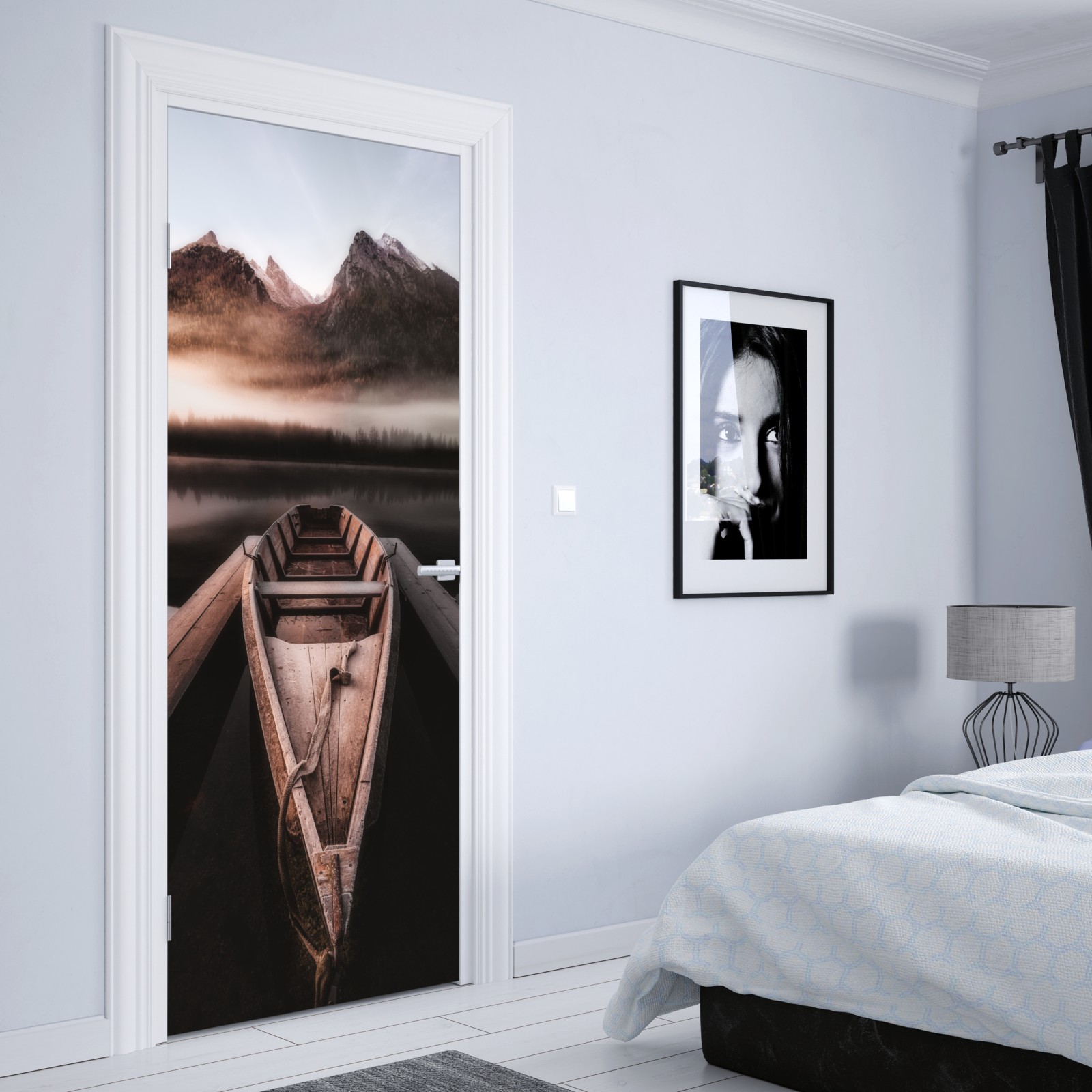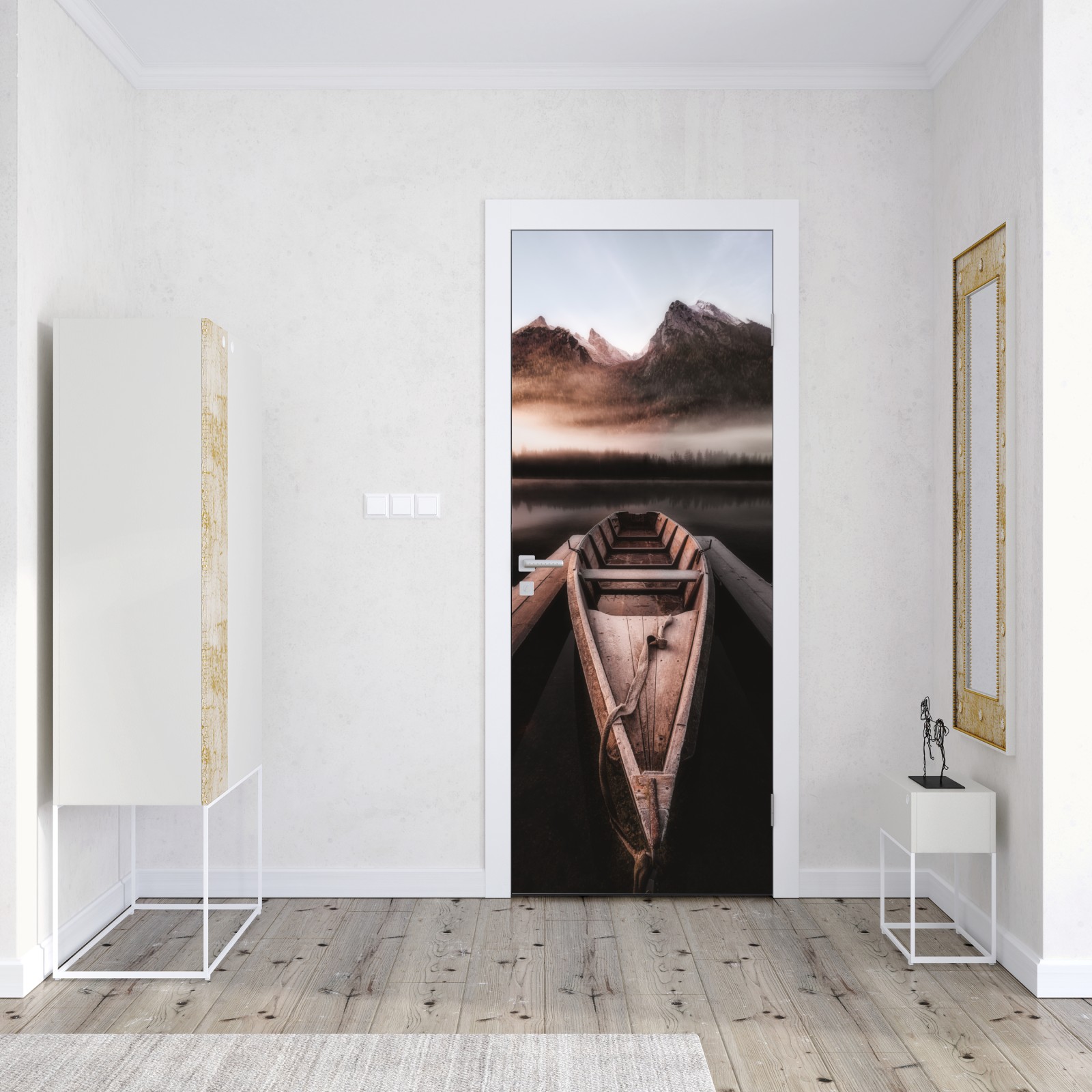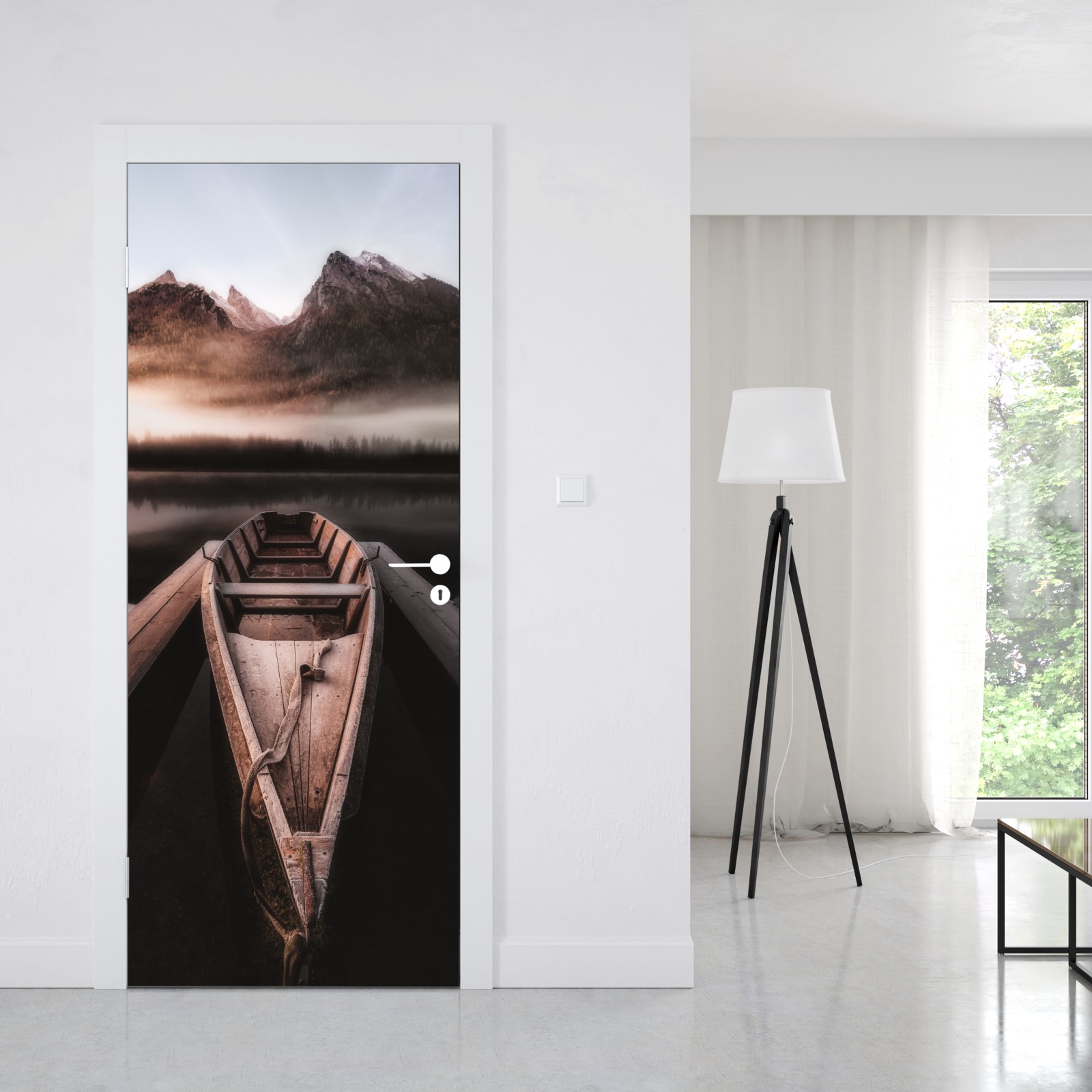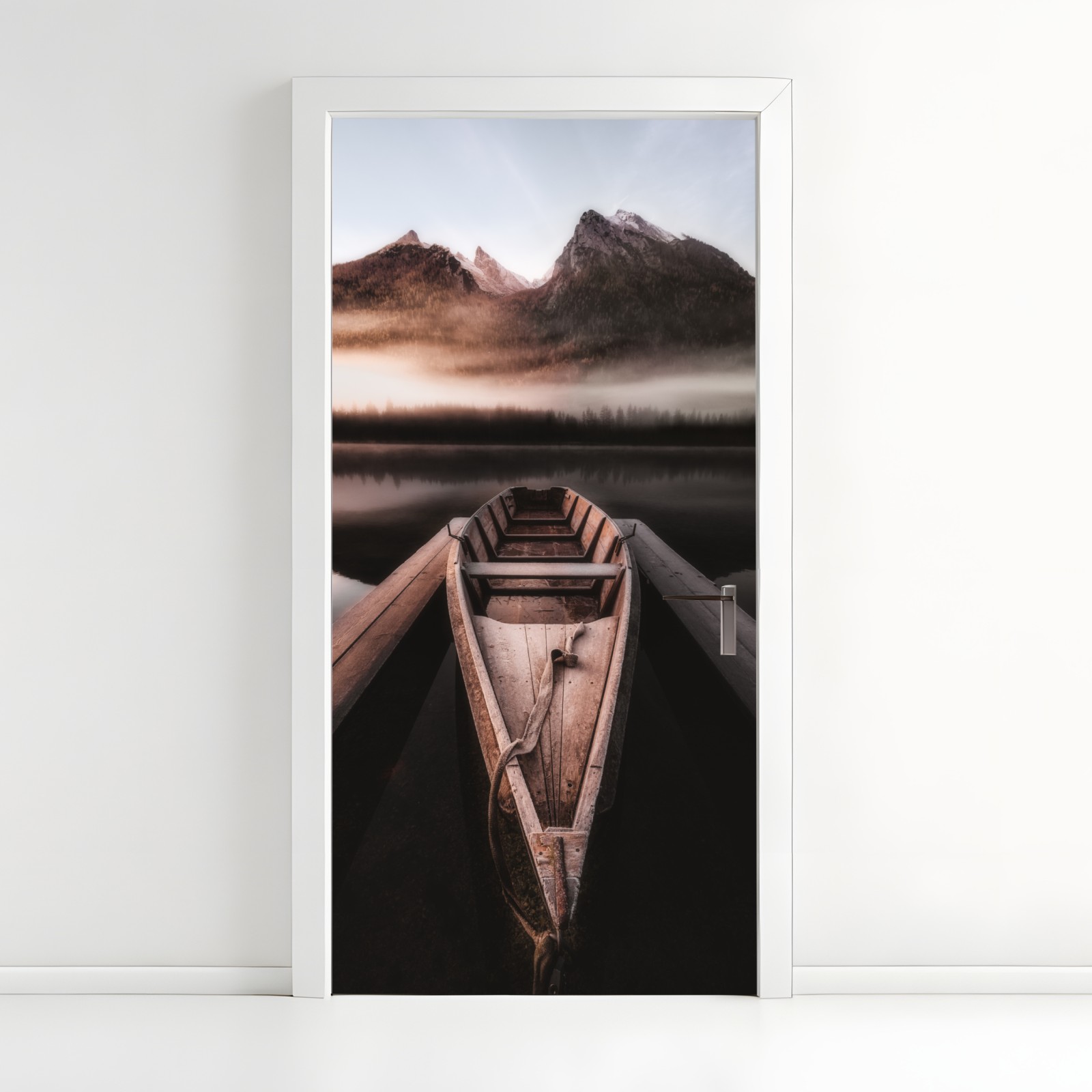 Naklejka na drzwi Mglista łódź przy górskim jeziorze