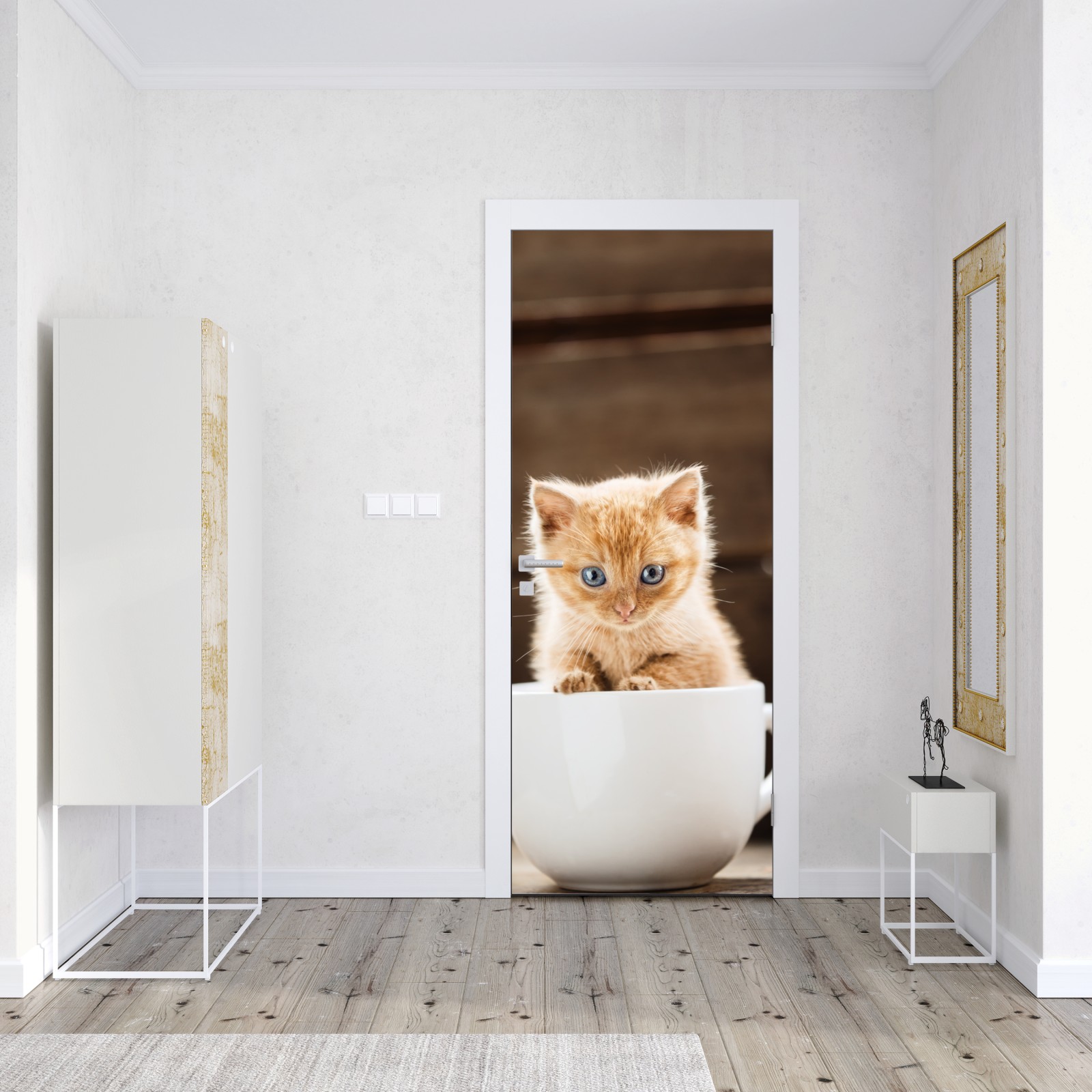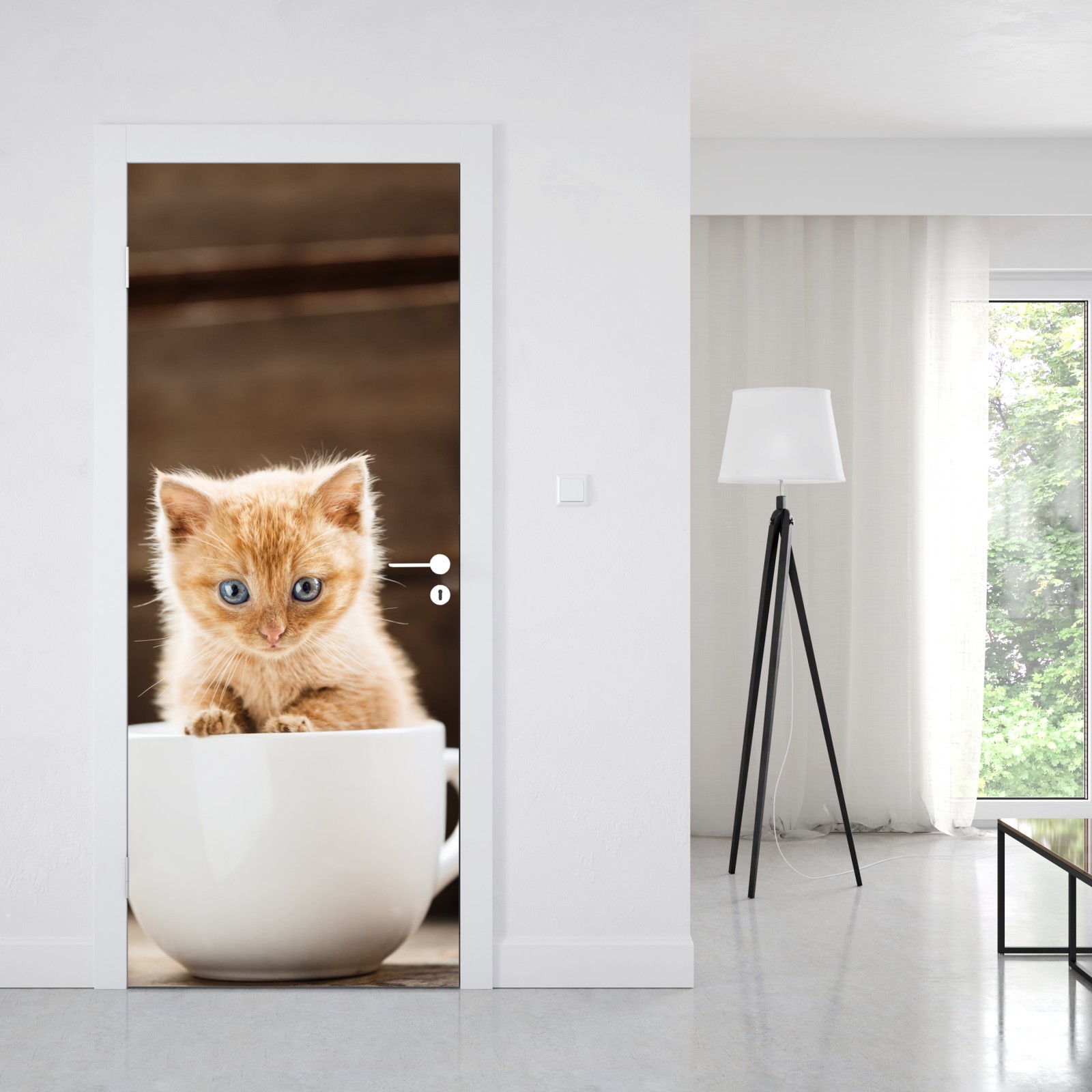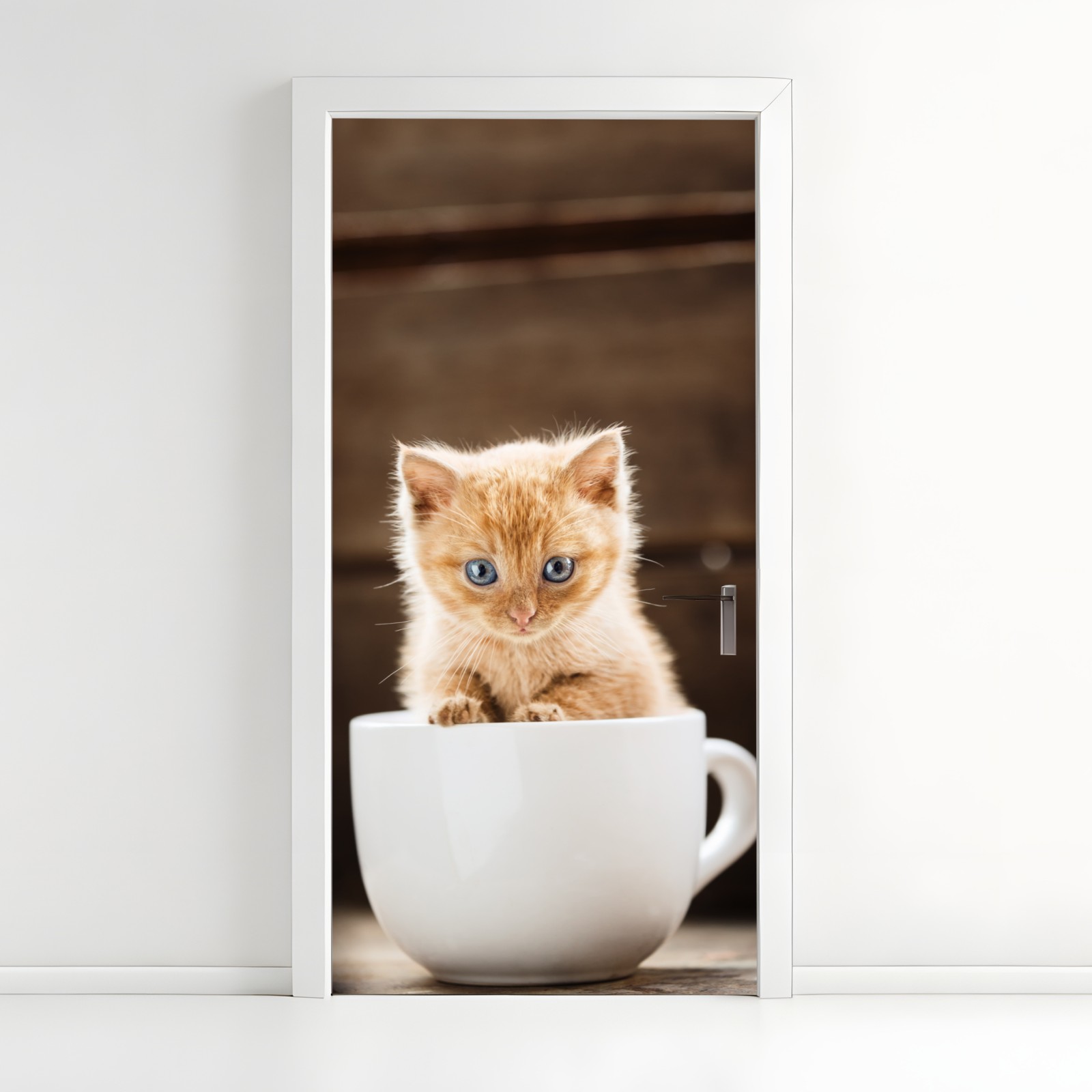 Uroczy rudy kociak zagląda z białej filiżanki, dodając ciepła i uroku każdemu wnętrzu.