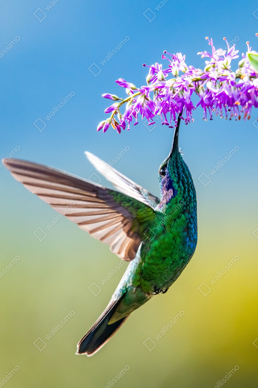 Wprowadź tropikalną energię do wnętrza dzięki zbliżeniu kolibra pobierającego nektar z fioletowego kwiatu.
