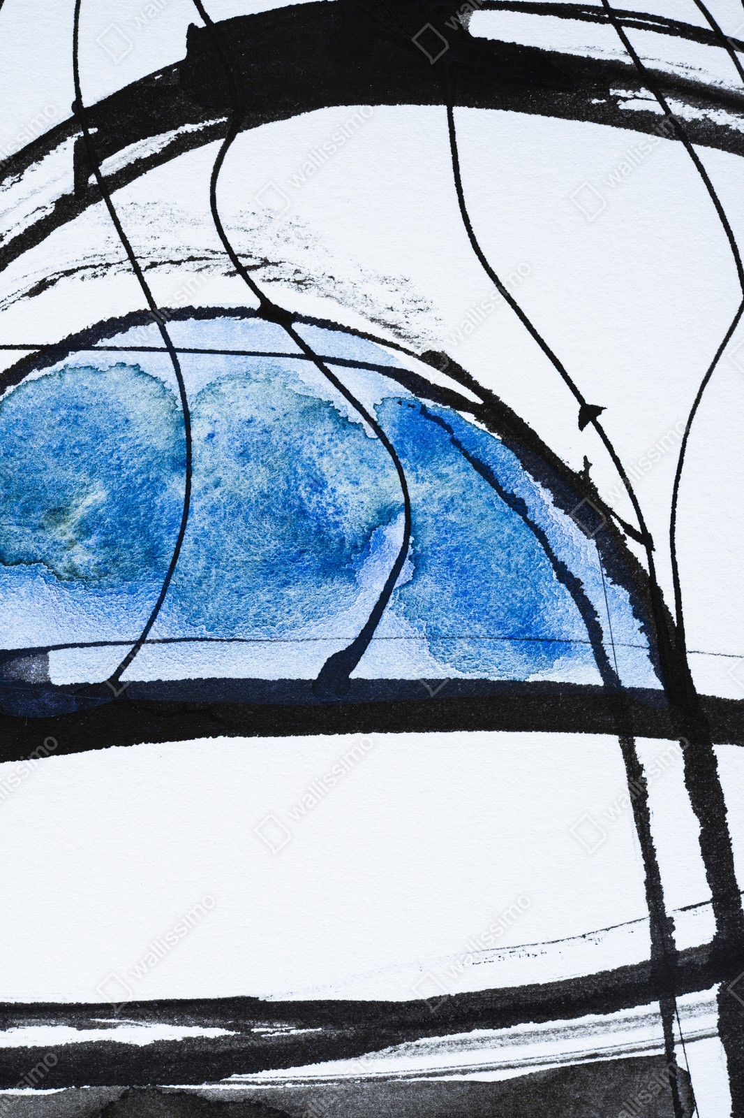 Elegancka abstrakcyjna kompozycja akwareli i tuszu w odcieniach niebieskiego i czerni, idealna do nowoczesnych wnętrz.