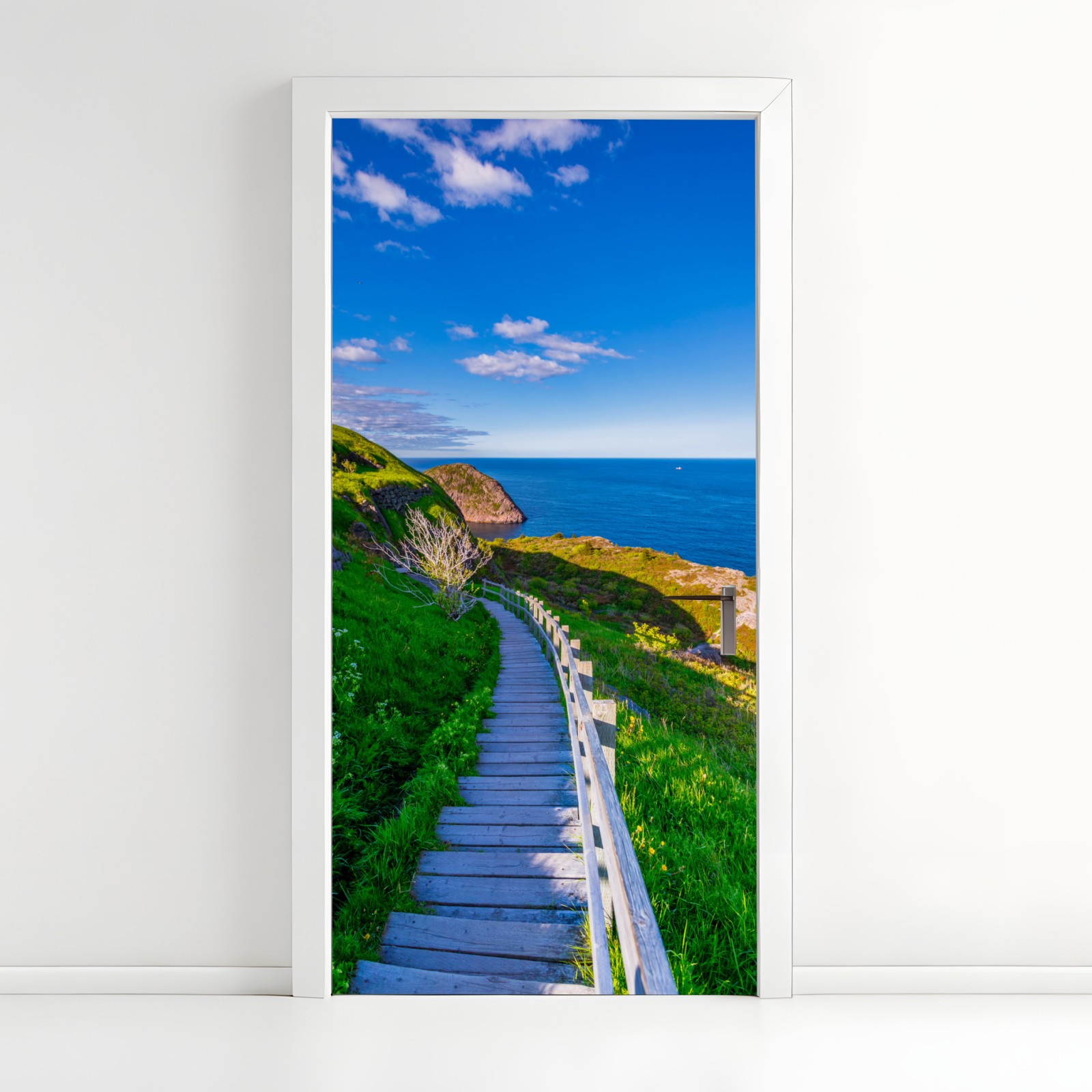 Wprowadź spokojny nadmorski klimat do wnętrza dzięki temu żywemu widokowi z drewnianą ścieżką, zielonymi klifami i głębokim błękitem morza.