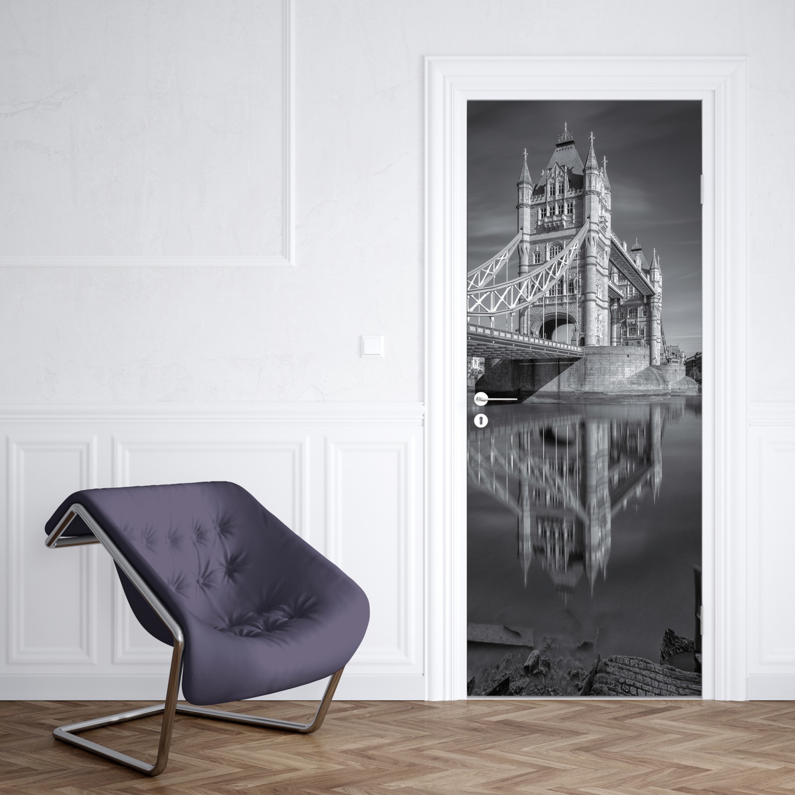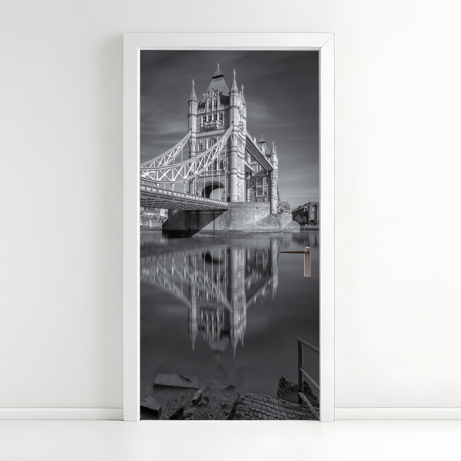 Naklejka na drzwi Tower Bridge odbicie w odcieniach szarości