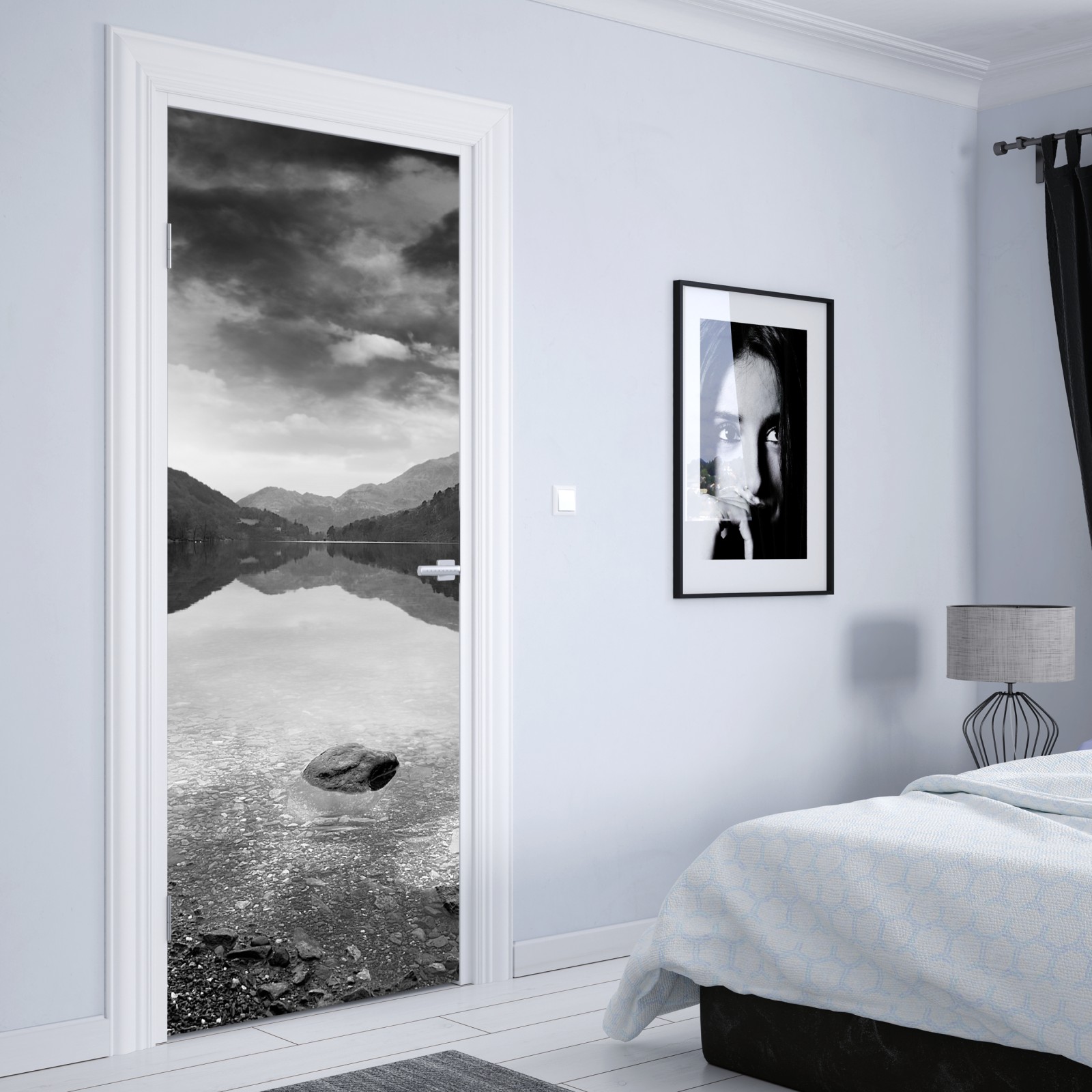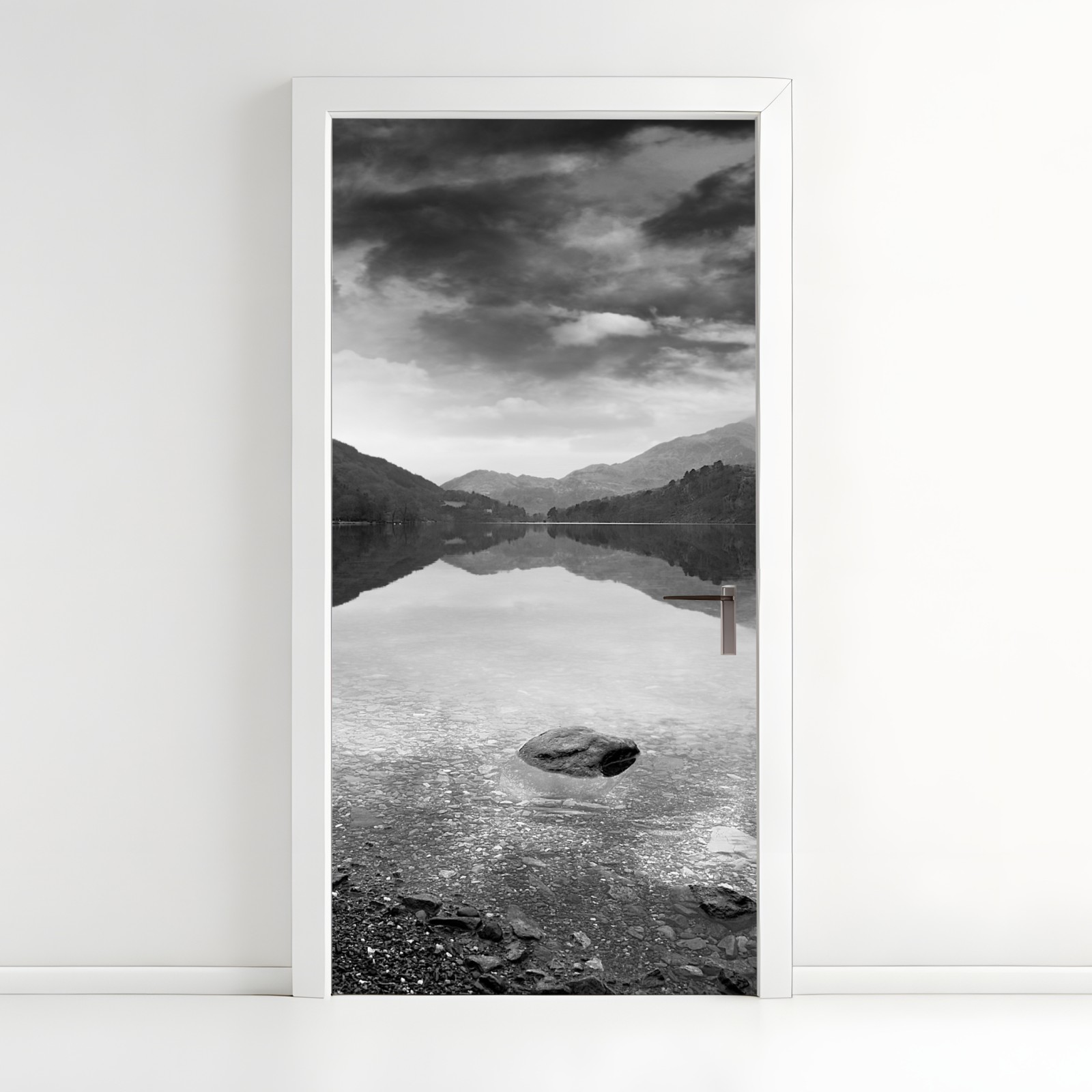 Dodaj wnętrzu stonowaną elegancję dzięki tej czarno-białej fotografii górskiego jeziora z idealnym odbiciem.