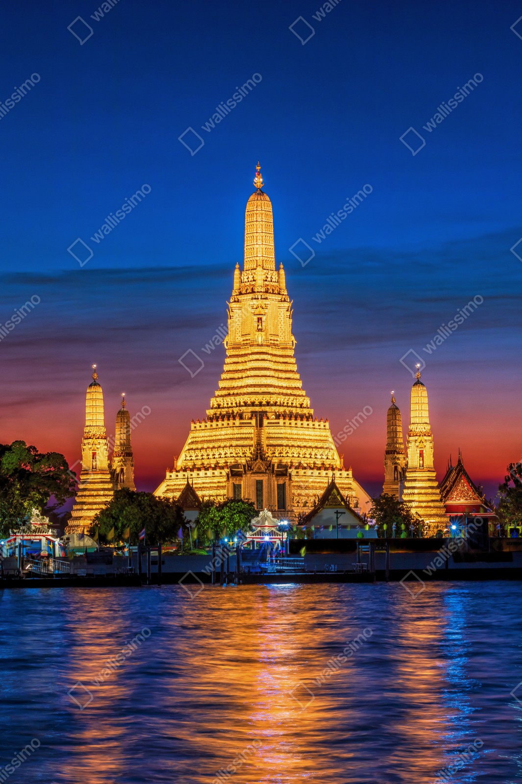 Poczuj blask Wat Arun o zmierzchu, imponująca historyczna świątynia, która wniesie ciepło i podróżniczy charakter do każdego wnętrza.