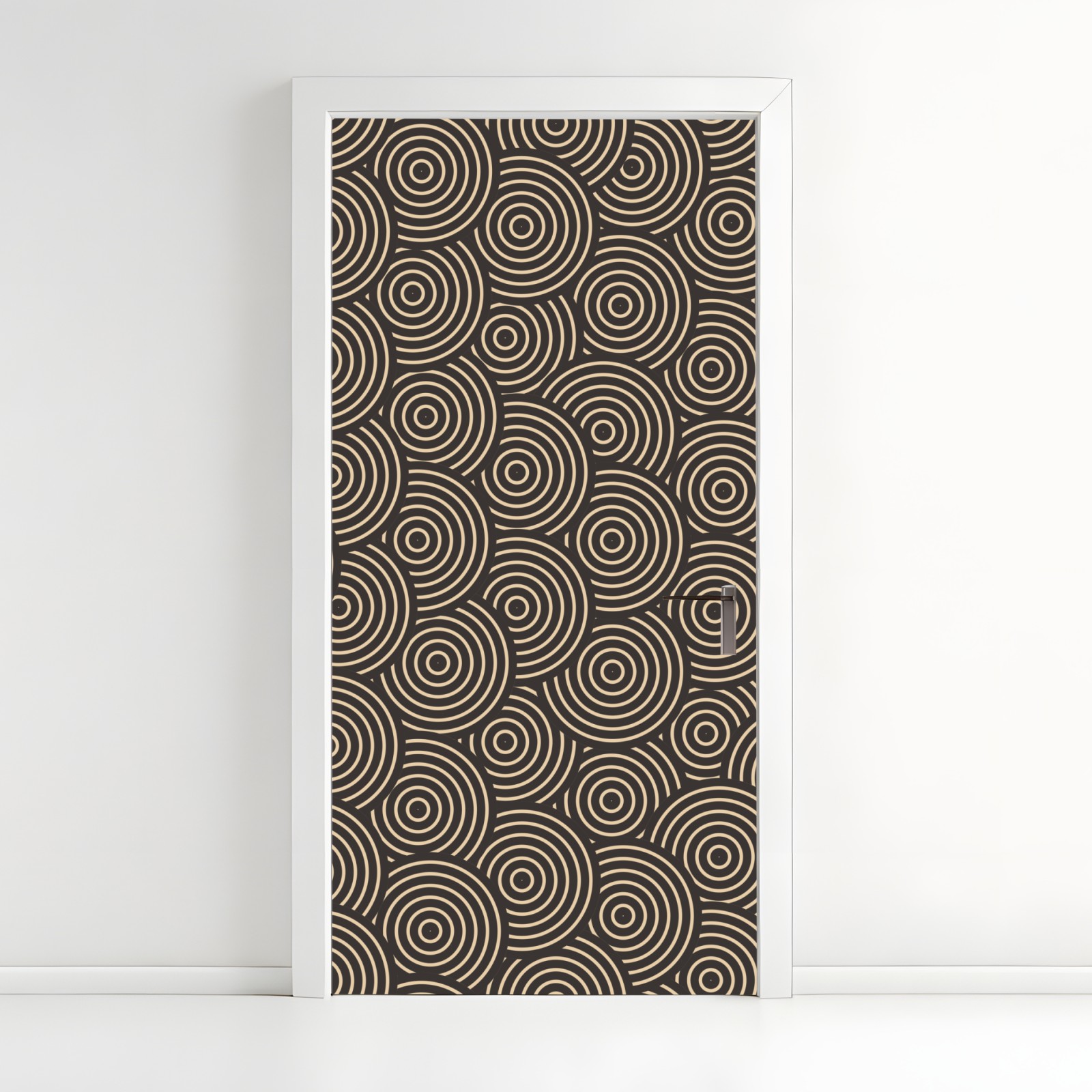 Dodaj ponadczasową geometryczną elegancję do wnętrza dzięki retro wzorowi beżowych i czarnych koncentrycznych kół, który dodaje głębi i stylu każdemu pomieszczeniu.