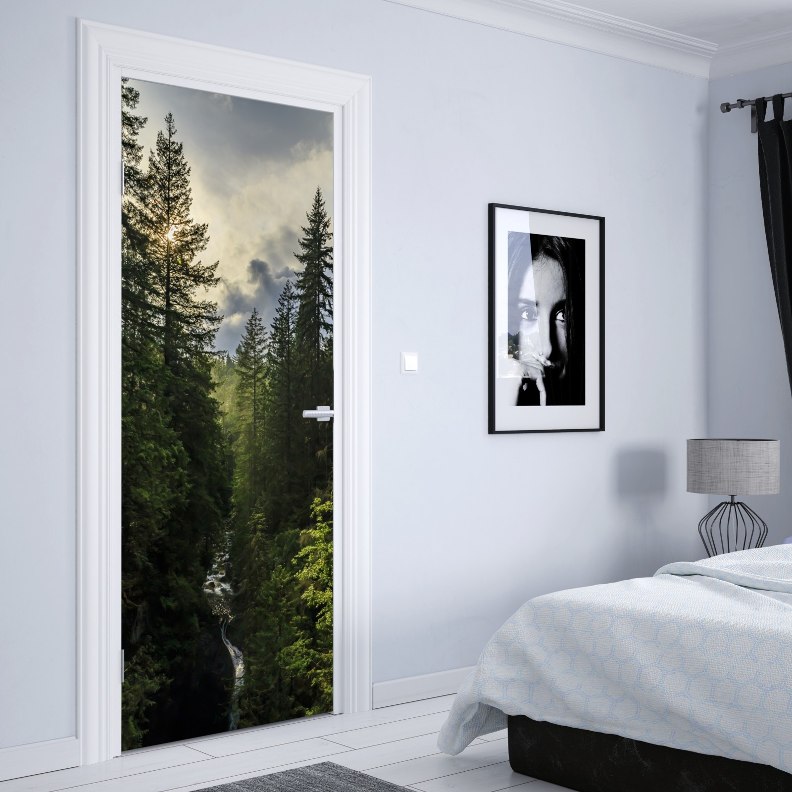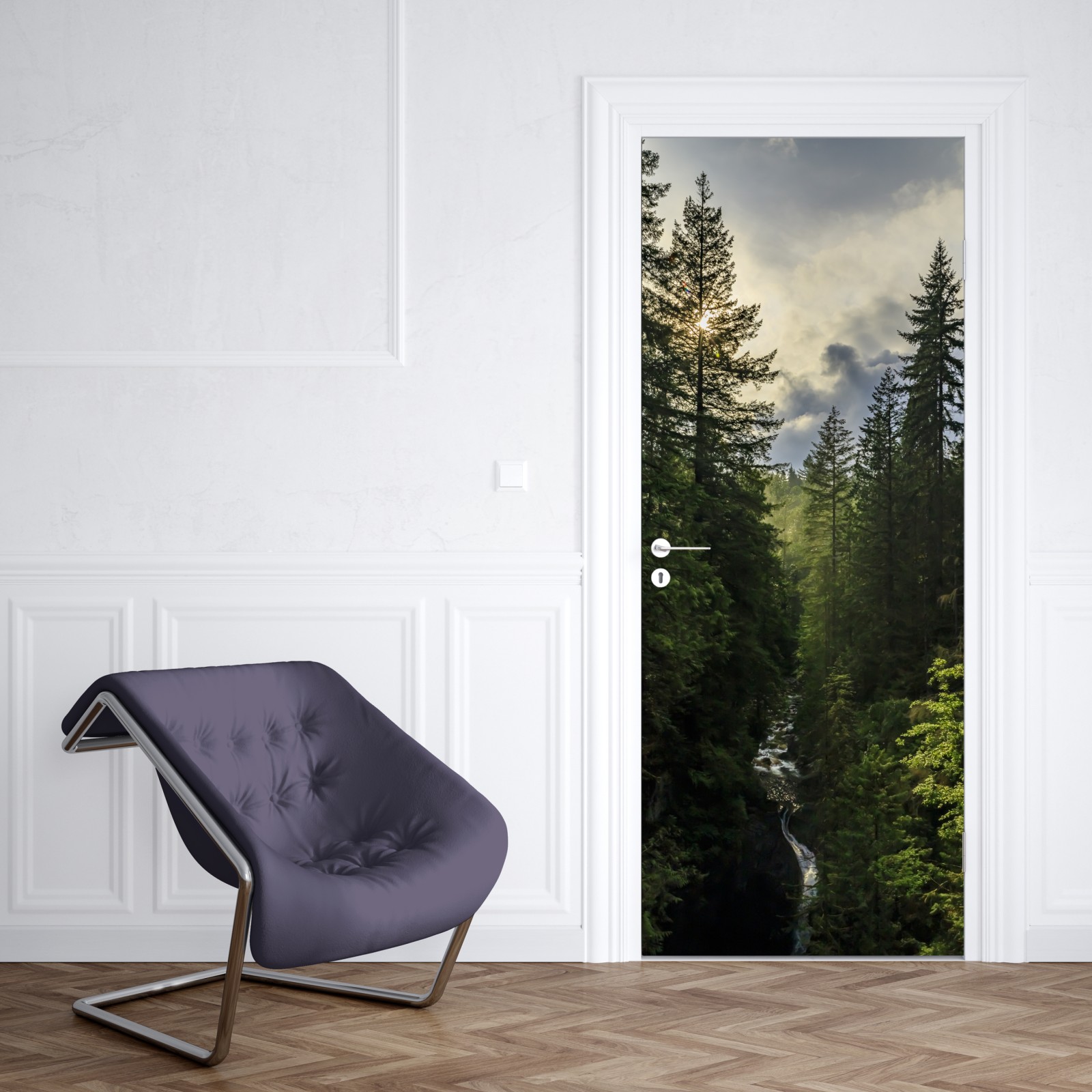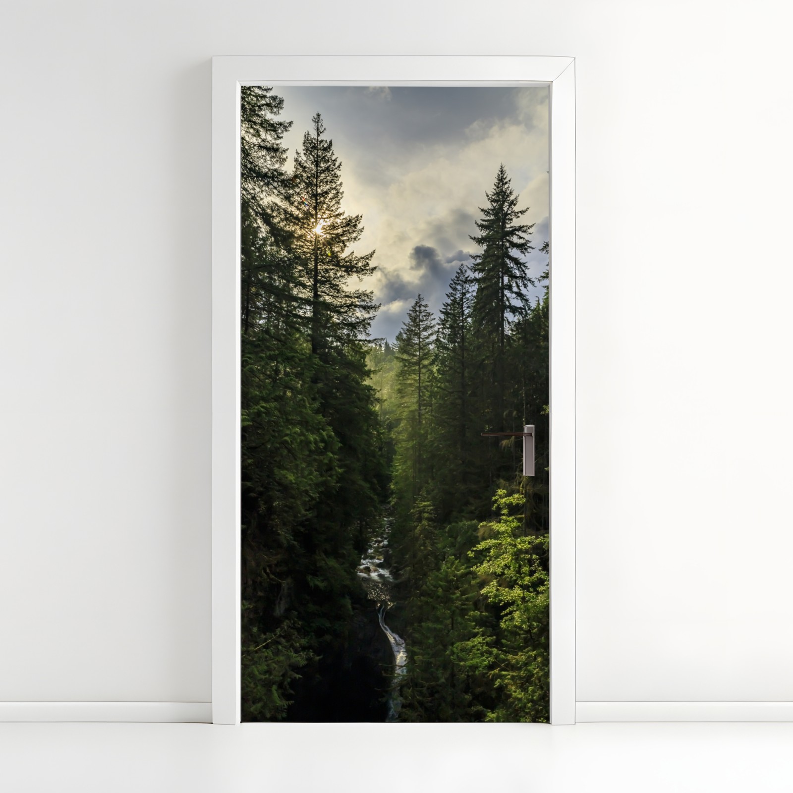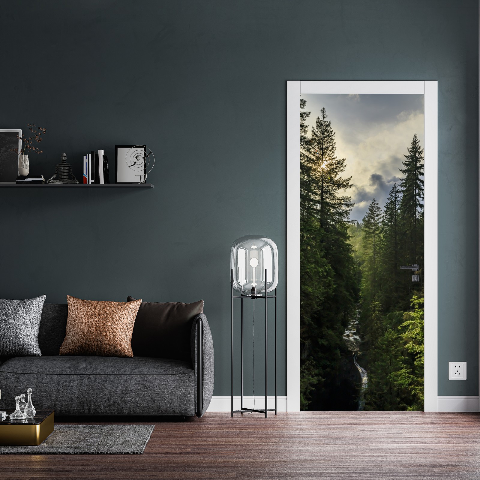Wprowadź kojącą atmosferę mglistych iglastych lasów do wnętrza dzięki temu pionowemu motywowi przyrodniczemu z ukrytym wodospadem i promieniami słońca.