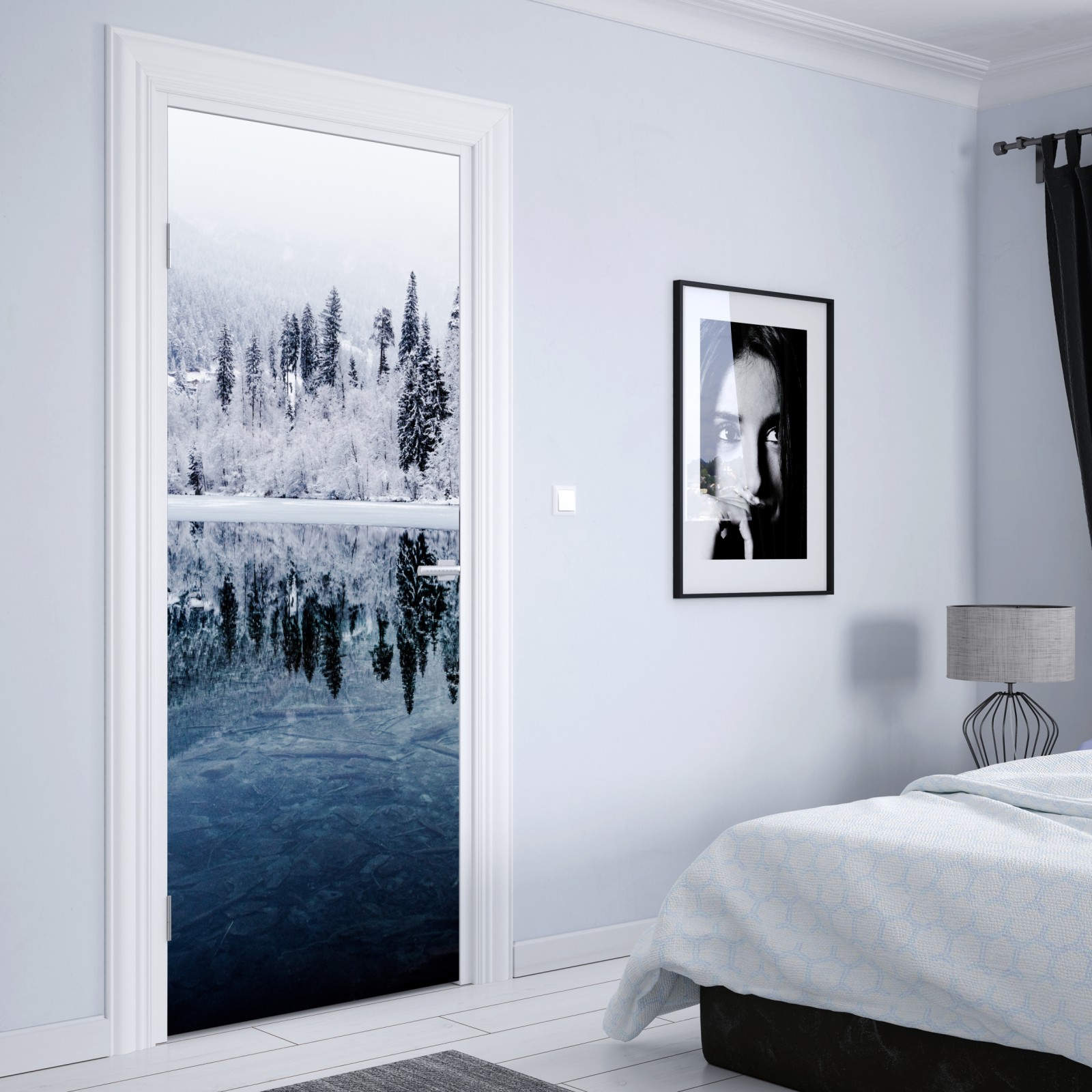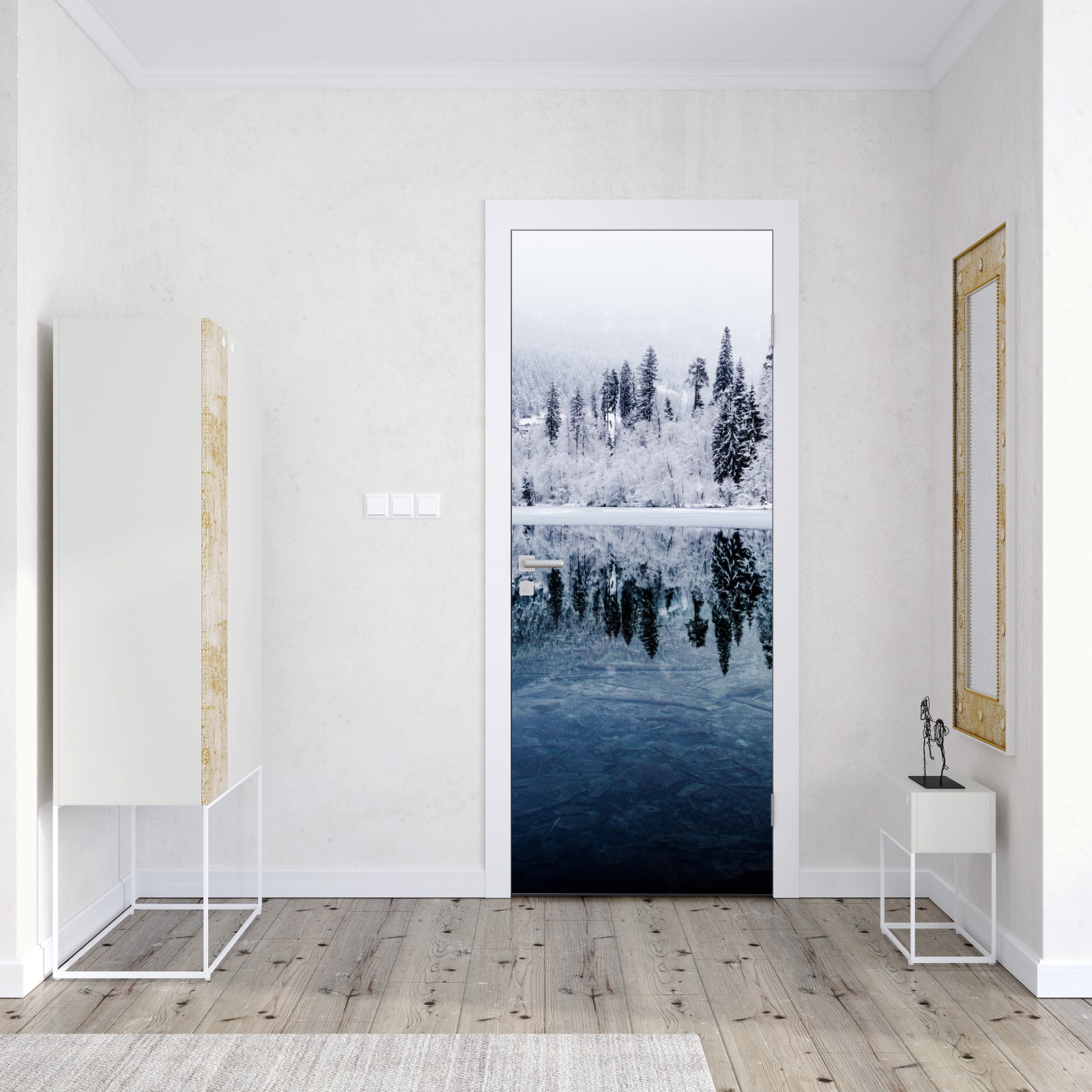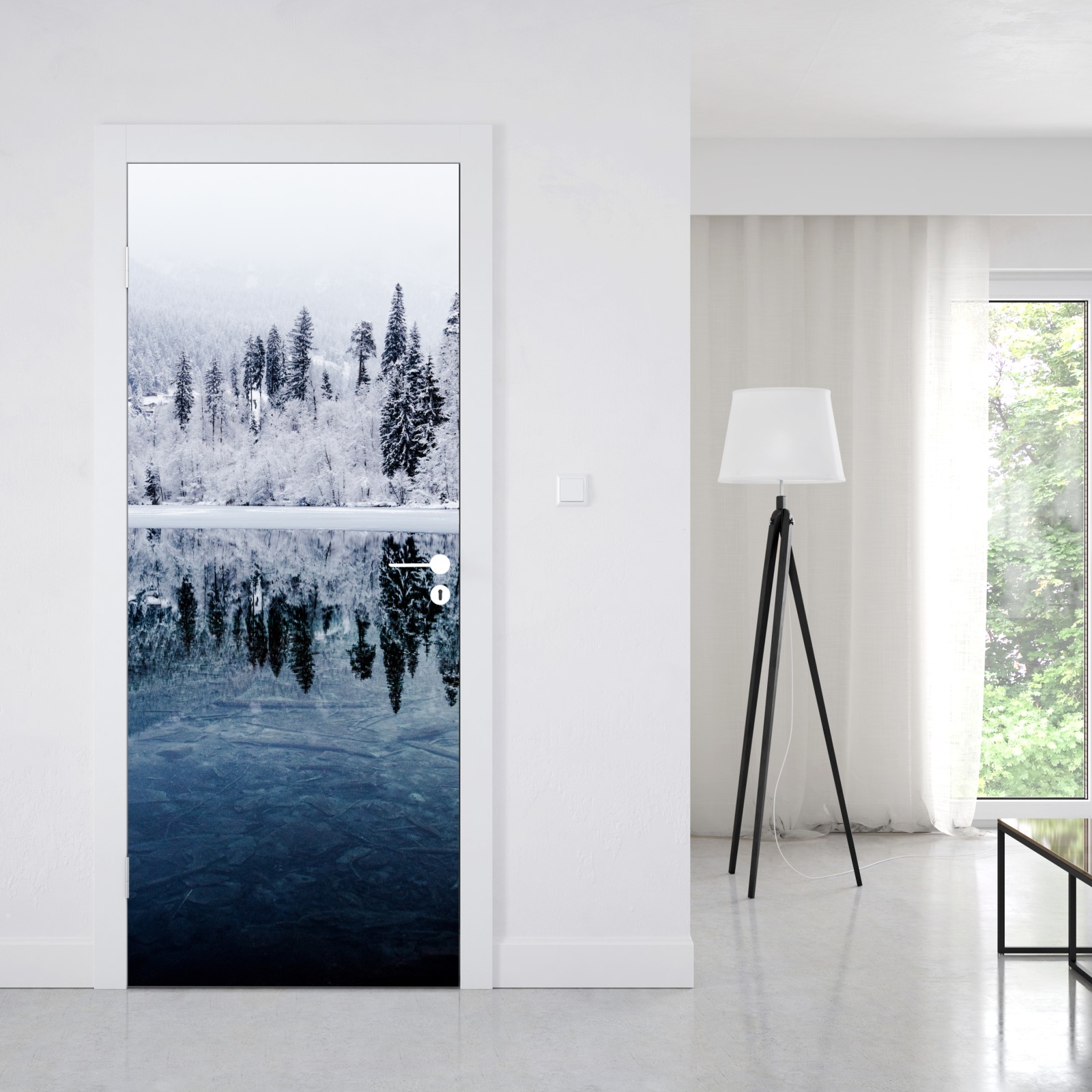 Naklejka na drzwi Zimowe jezioro z odbiciem w śnieżnym lesie
