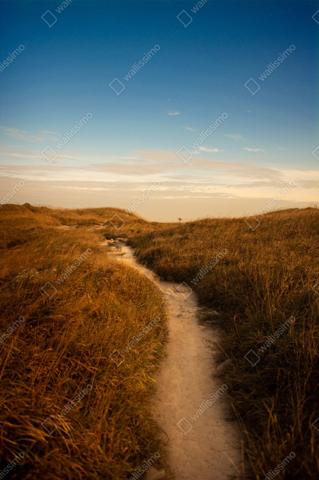 Wprowadź nadmorską ciszę do wnętrza dzięki temu zdjęciu wydm o złotej godzinie, z miękką trawą i rozległym niebem.