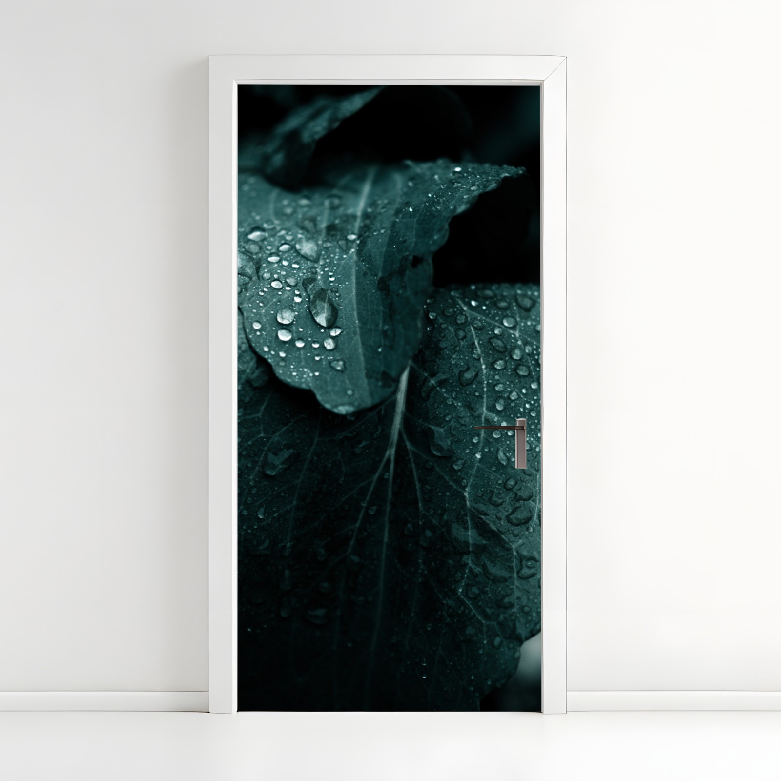 Dodaj natury i spokoju do wnętrza dzięki zbliżeniu kropli rosy na liściach w uspokajających turkusowych tonach.