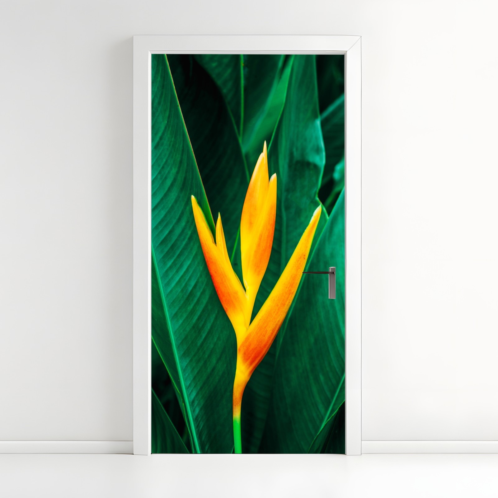 Naklejka na drzwi Żywy tropikalny kwiat heliconia na tle zielonych liści