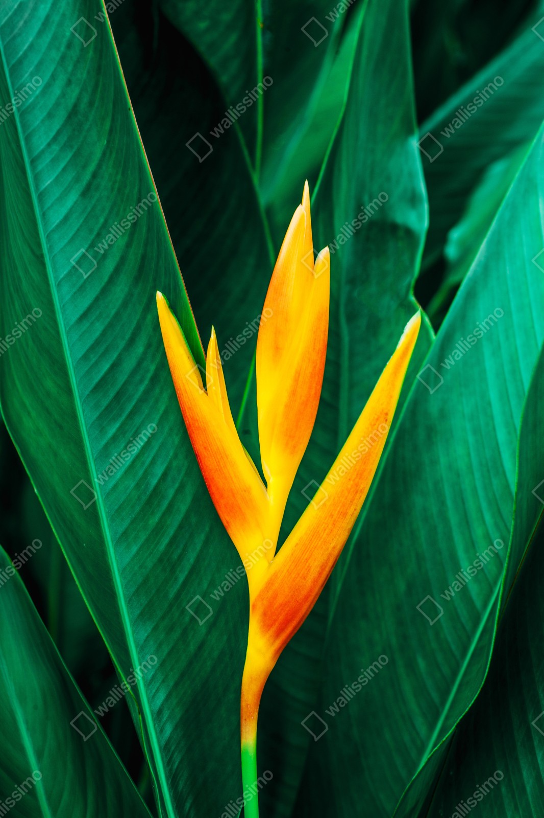Dodaj tropikalnego charakteru do wnętrza dzięki tej barwnej fotografii heliconii z intensywnie zielonymi liśćmi.