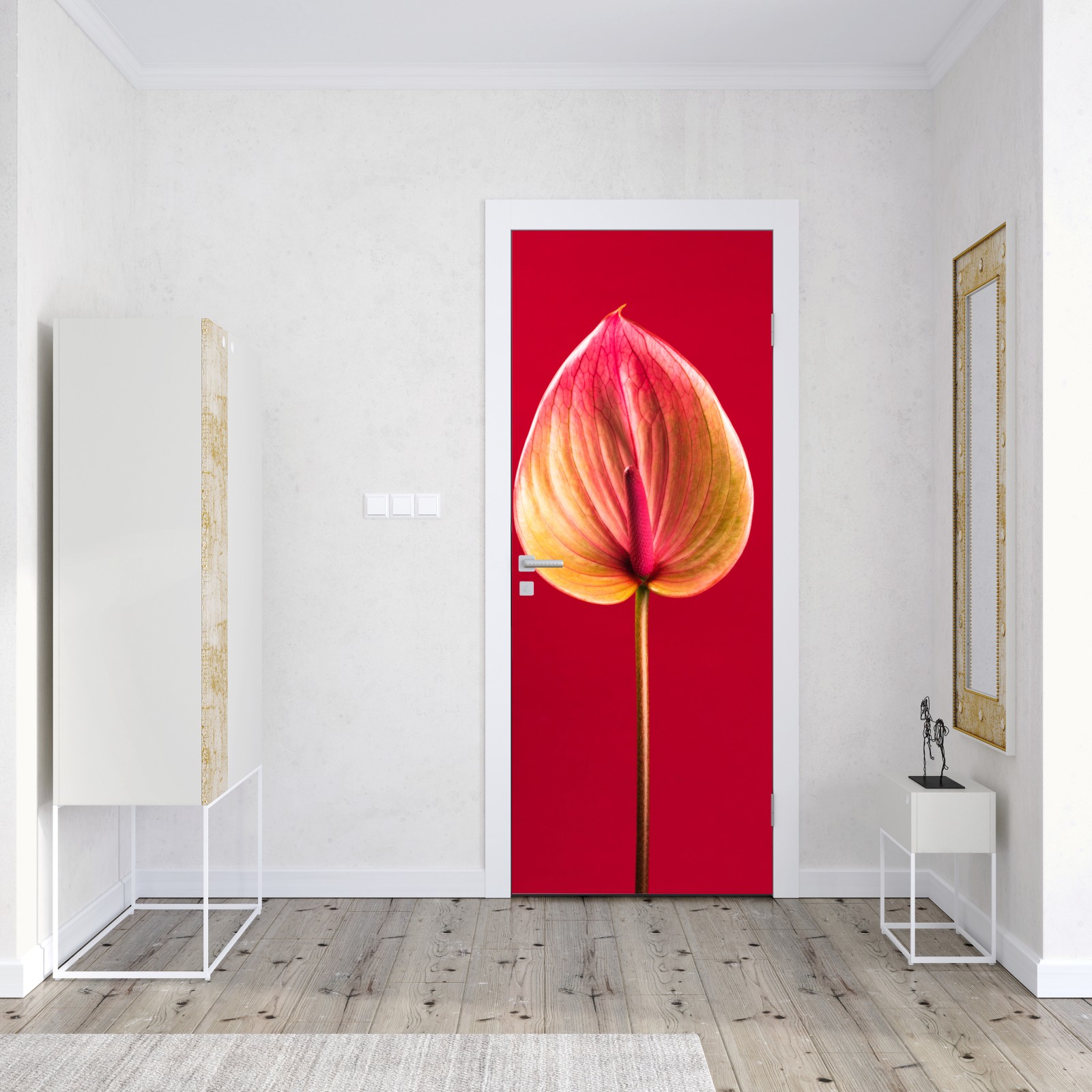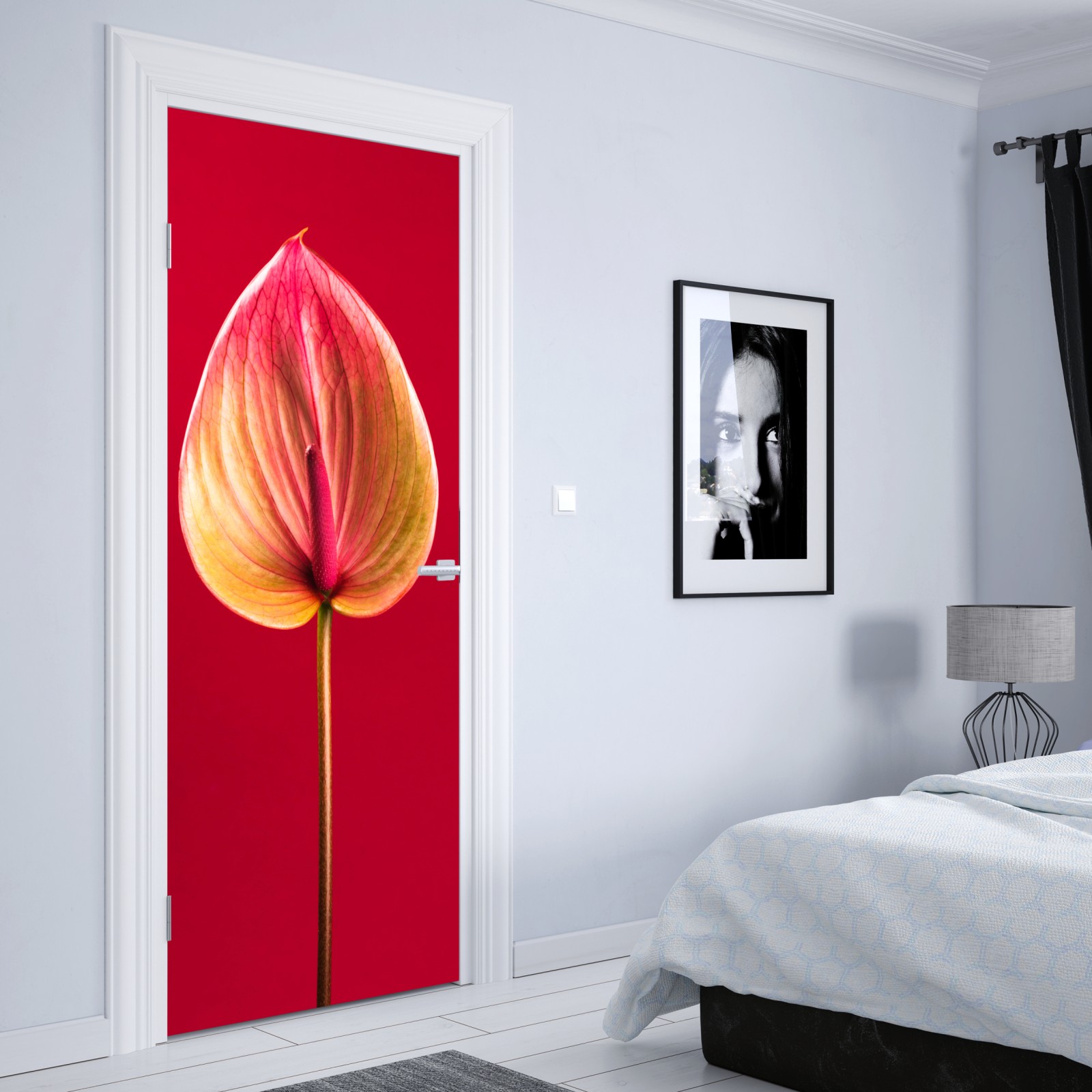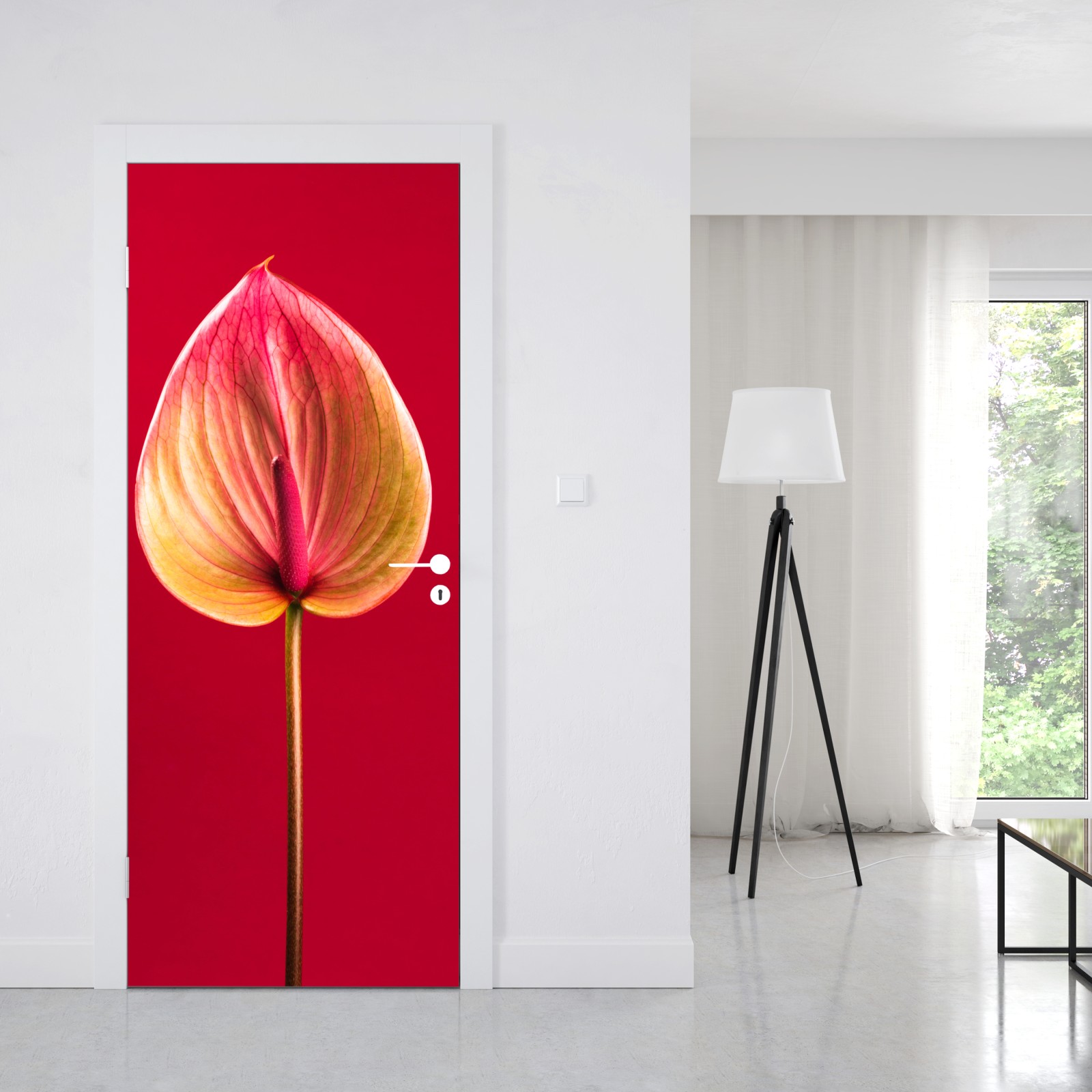 Naklejka na drzwi Eleganckie anturium na czerwonym tle