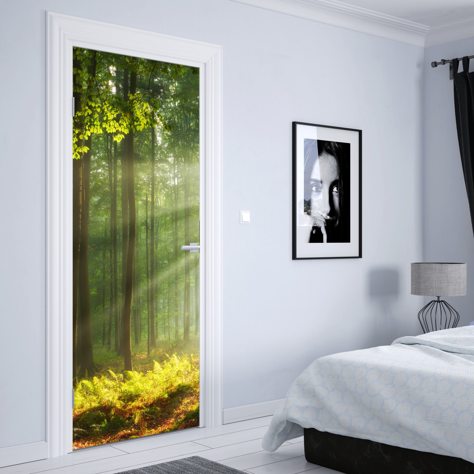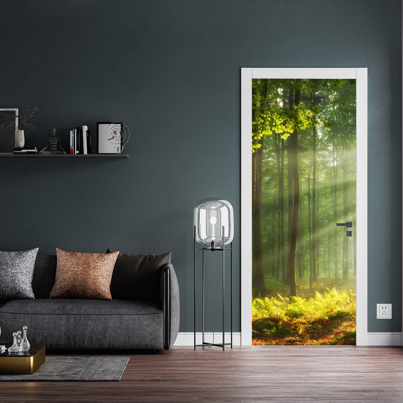 Wprowadź spokój i naturalne piękno do swojego wnętrza dzięki temu leśnemu widokowi o porannych promieniach światła przebijających się przez drzewa.