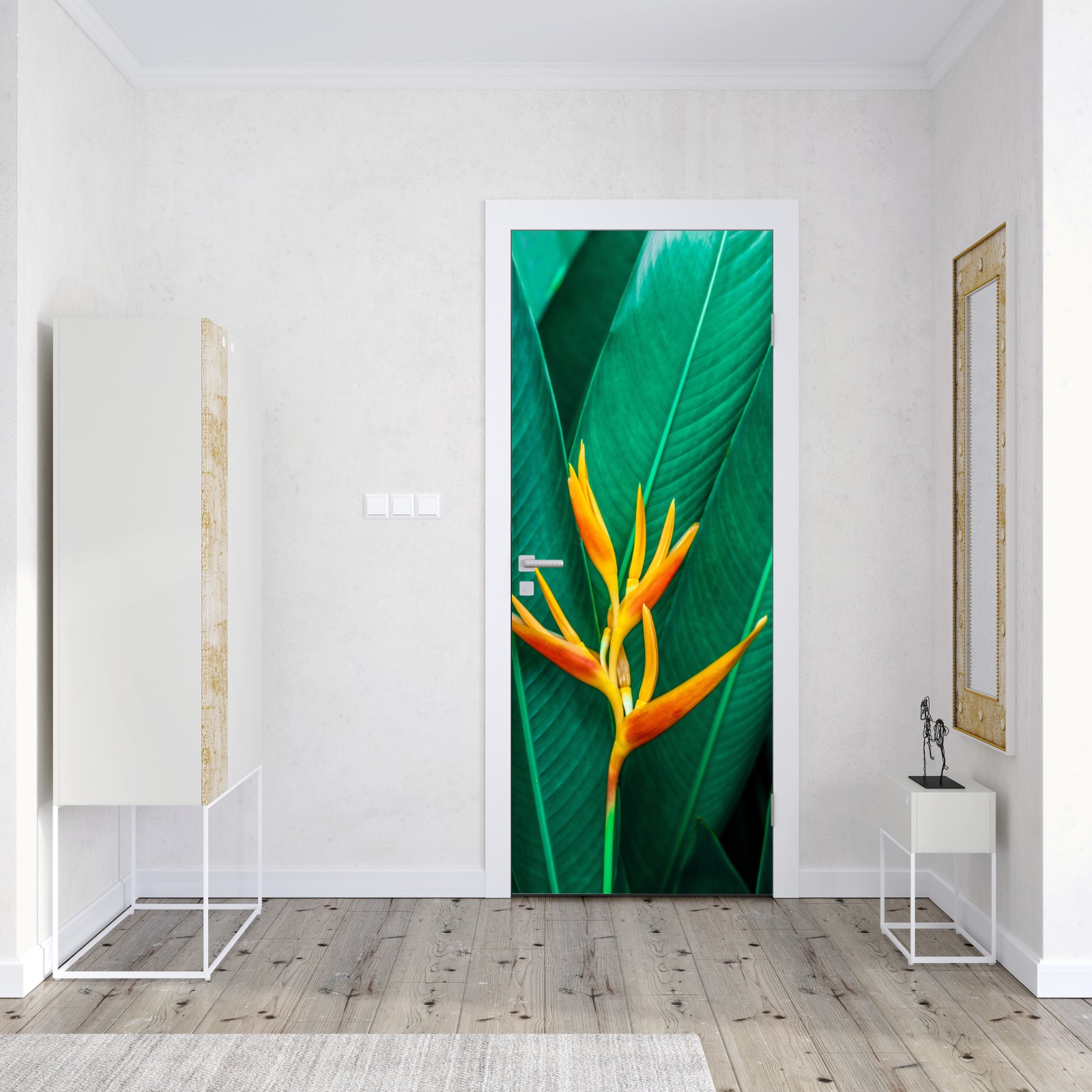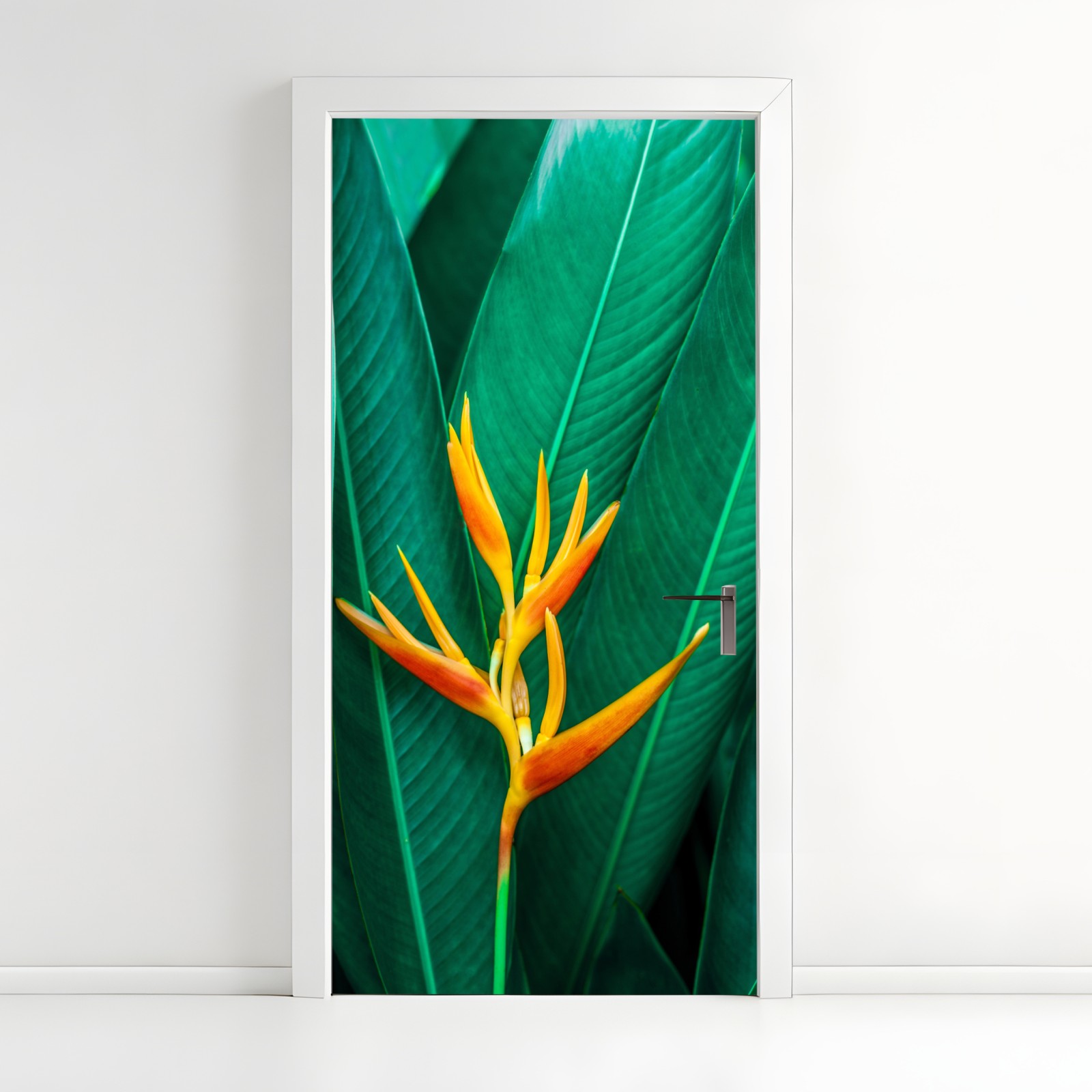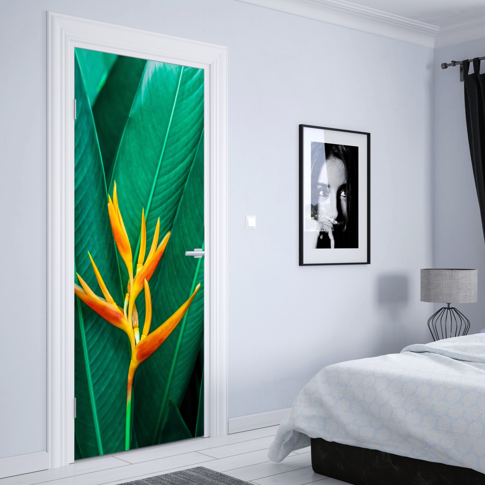 Naklejka na drzwi Intensywny tropikalny ptak rajski na zielonych liściach