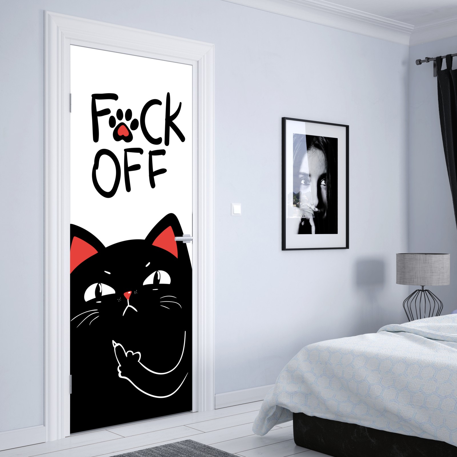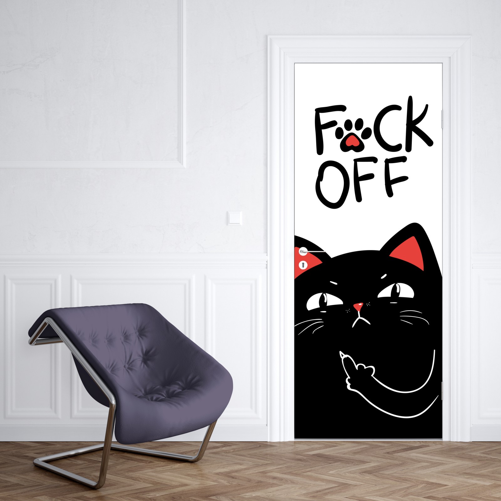 Dodaj odważny akcent do swojego wnętrza dzięki tej zabawnej ilustracji czarnego kota, która wnosi nowoczesny i prześmiewczy charakter.