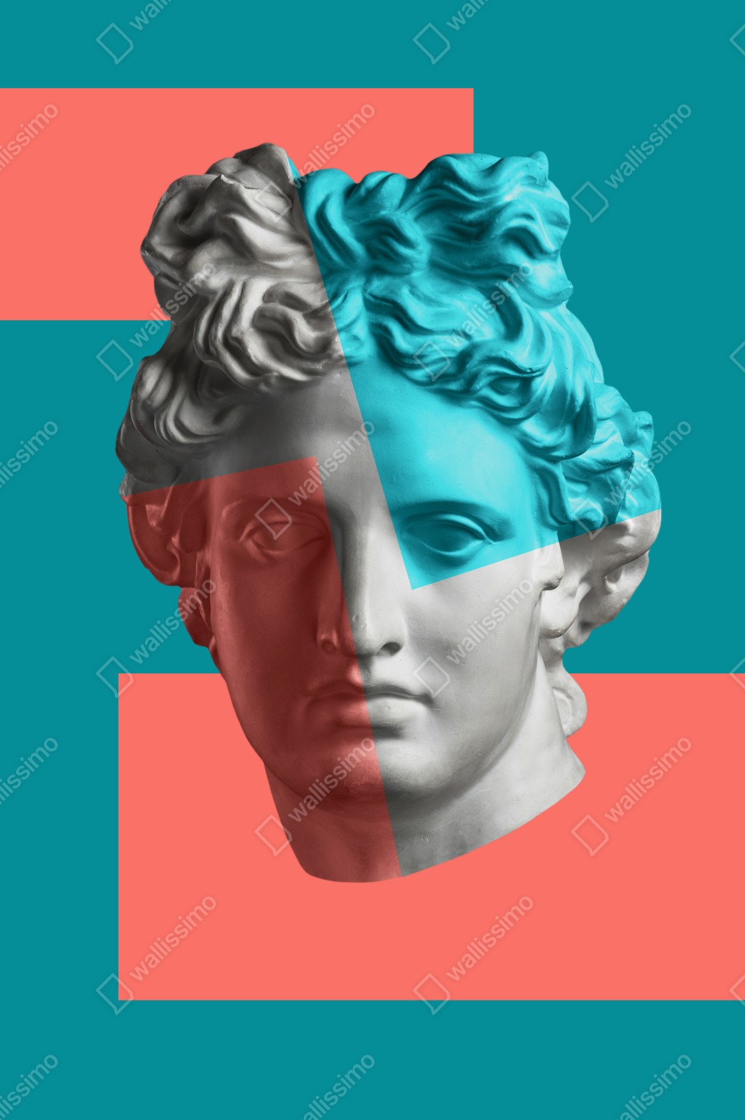 Dodaj odważny, nowoczesny akcent do wnętrza dzięki temu duotonalnemu kolażowi głowy klasycznej w turkusowych i koralowych barwach.