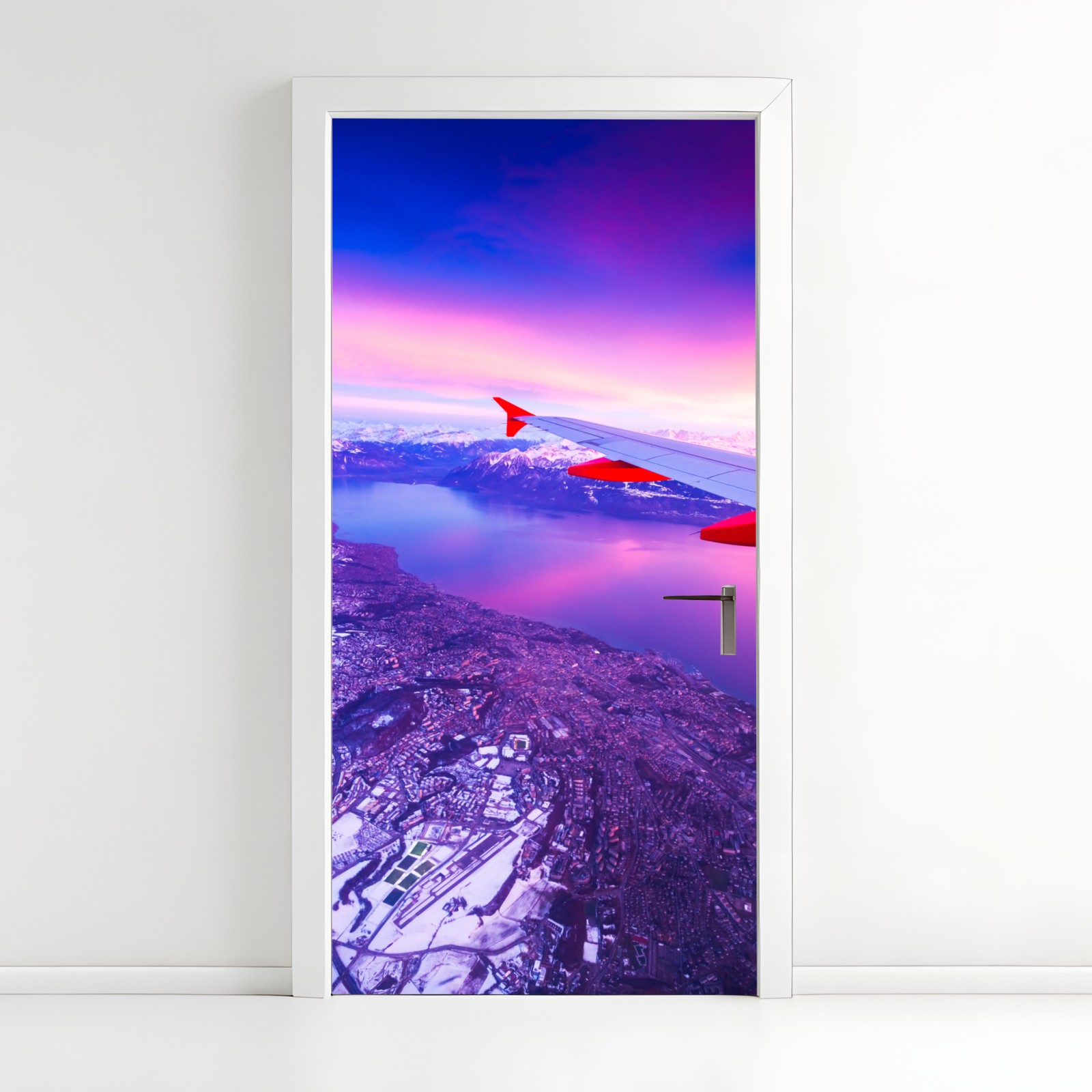 Wzbogać swoje wnętrze o żywy widok z lotu ptaka na jezioro i górski horyzont uchwycony z okna samolotu.