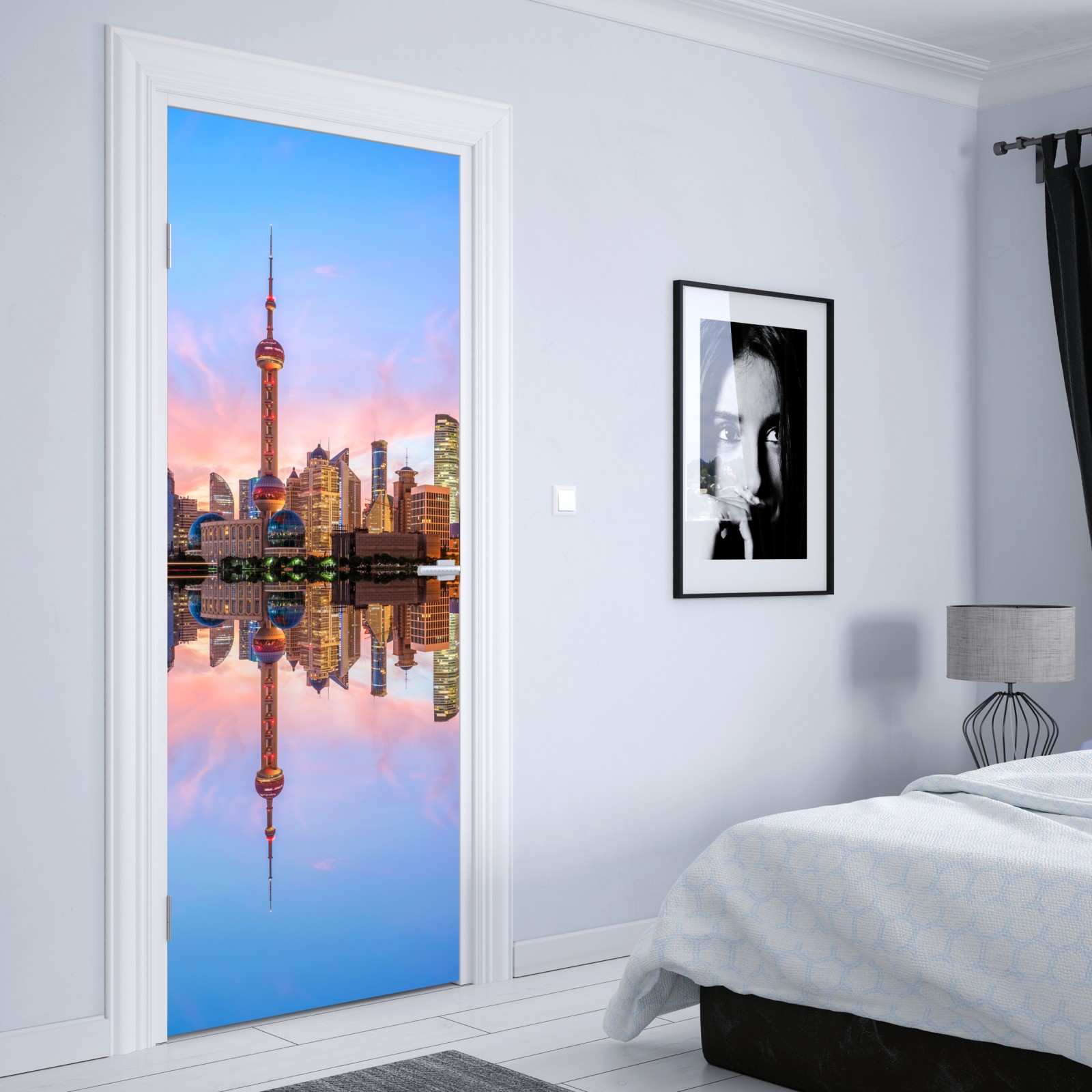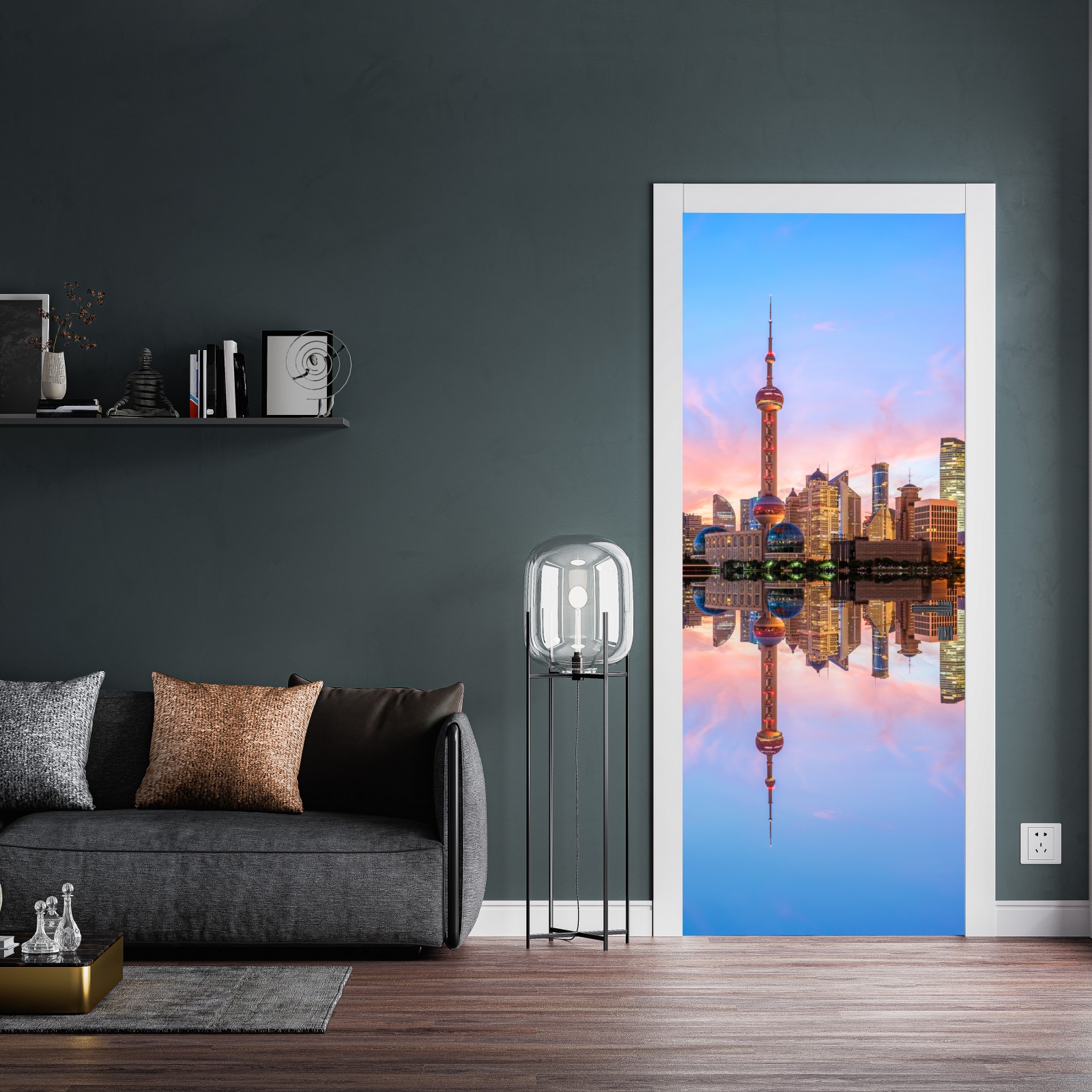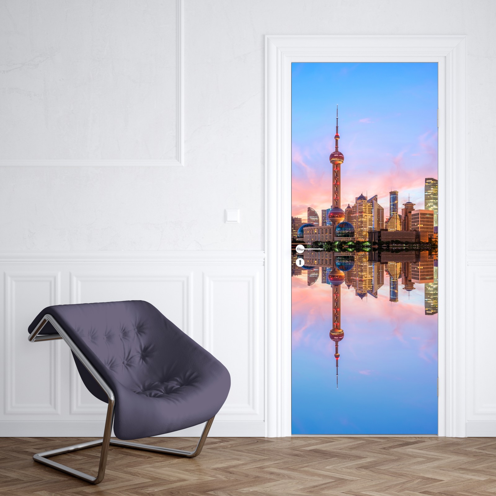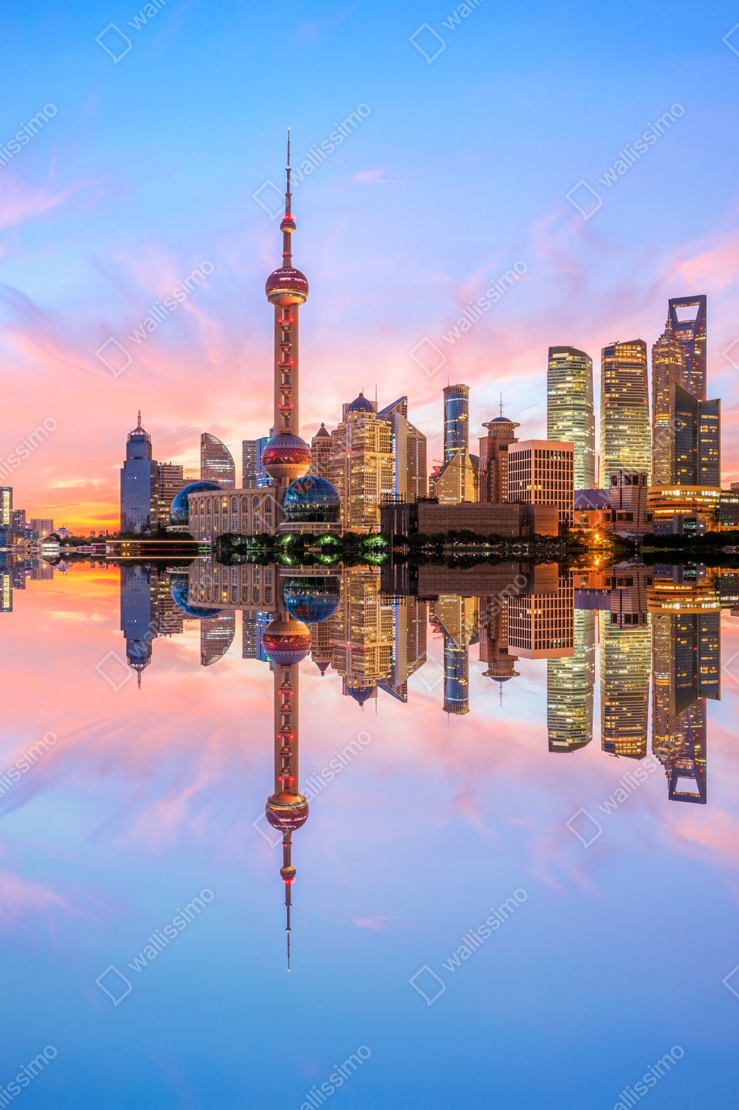 Dodaj do wnętrza świeżą energię Szanghaju dzięki pastelowemu krajobrazowi miejskiego poranka z lustrzanym odbiciem na wodzie.
