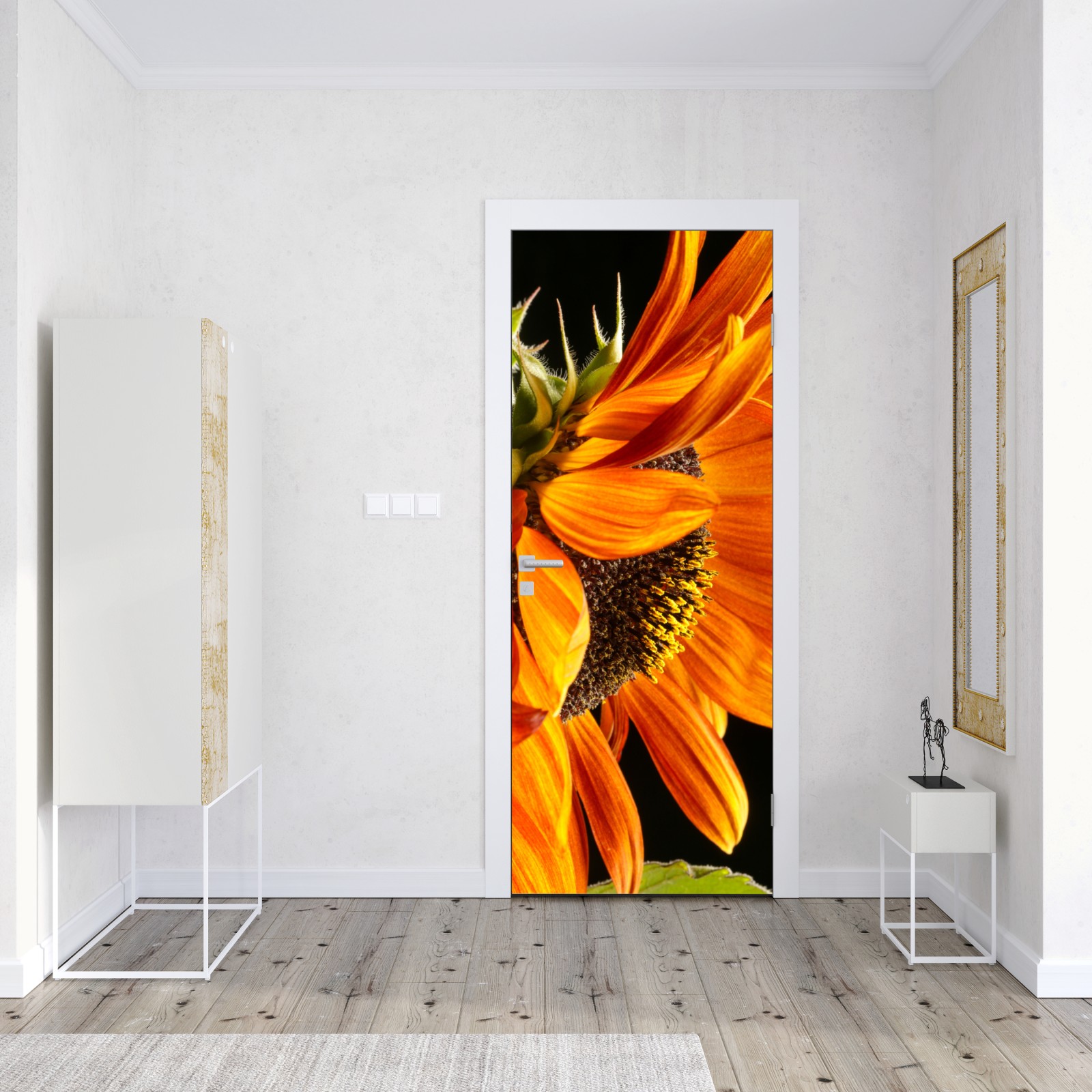Rozświetl swoje wnętrze intensywnym zbliżeniem pomarańczowego słonecznika, które podkreśla fakturę płatków i naturalne ciepło.