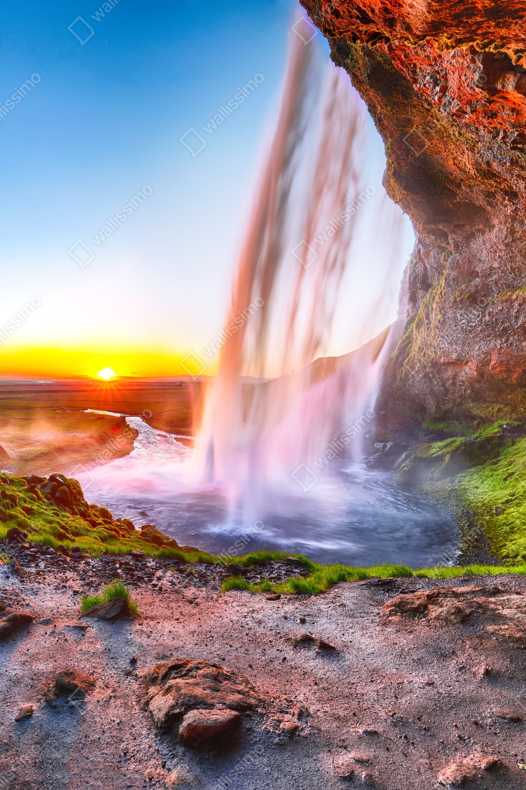 Wprowadź dramatyczne piękno wodospadu Seljalandsfoss o zachodzie słońca do swojego wnętrza dzięki żywym kolorom i uspokajającemu ruchowi.