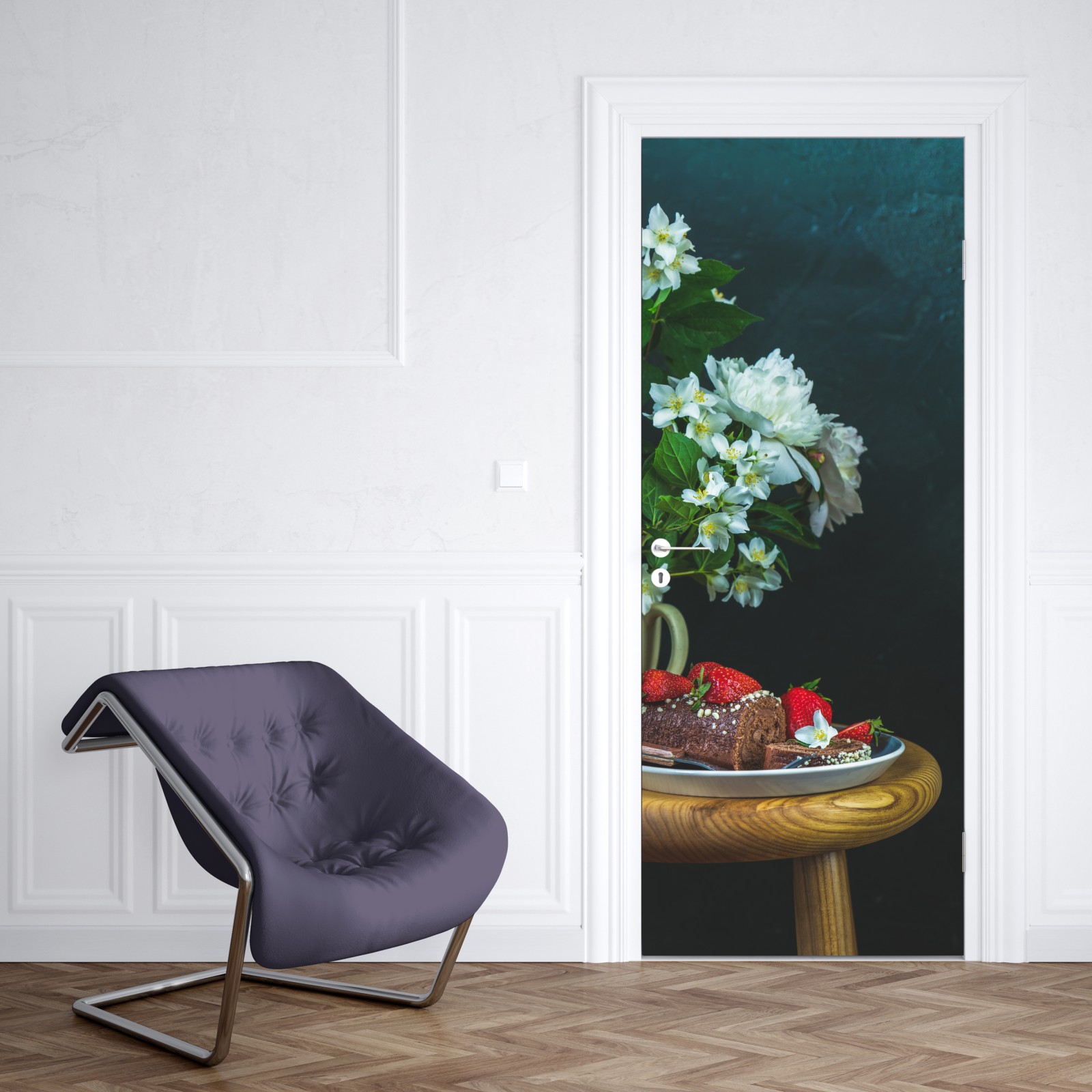 Naklejka na drzwi Rolada czekoladowa z truskawkami i białymi kwiatami
