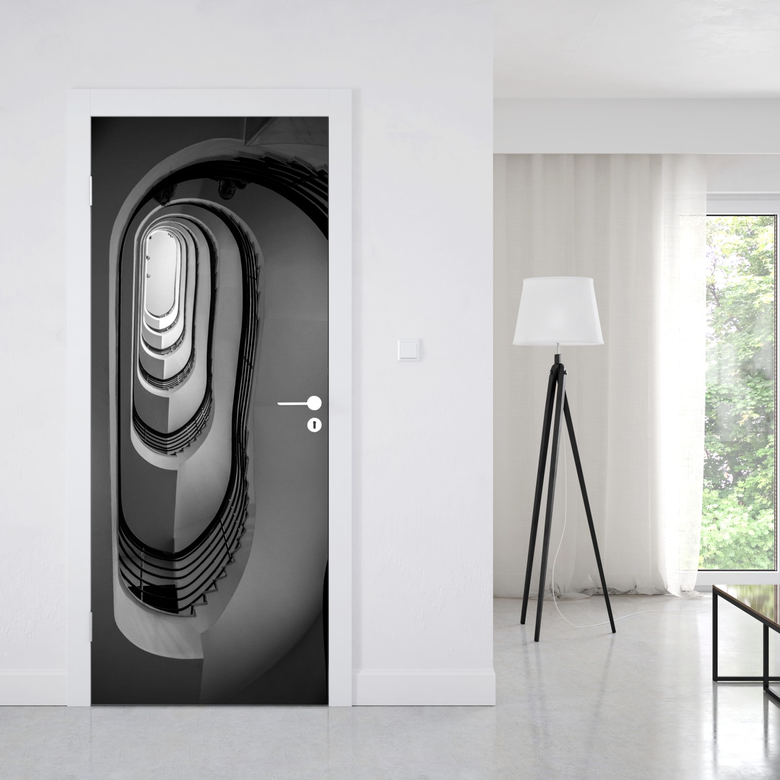 Naklejka na drzwi Spiralne schody w perspektywie czarno-białe