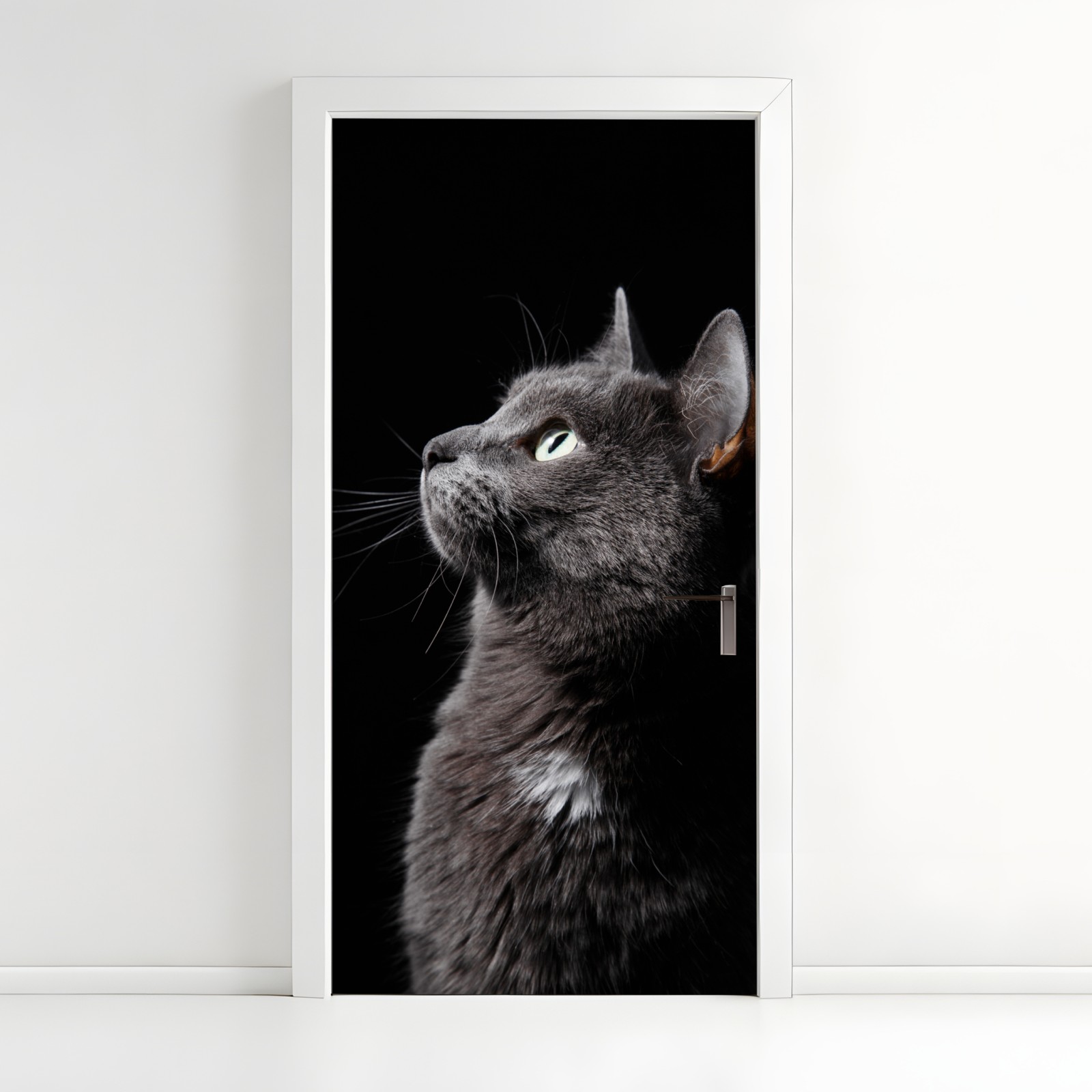 Dodaj subtelnej elegancji do wnętrza dzięki temu zbliżeniu szarego kota z hipnotyzującymi zielonymi oczami i dramatycznym oświetleniem.