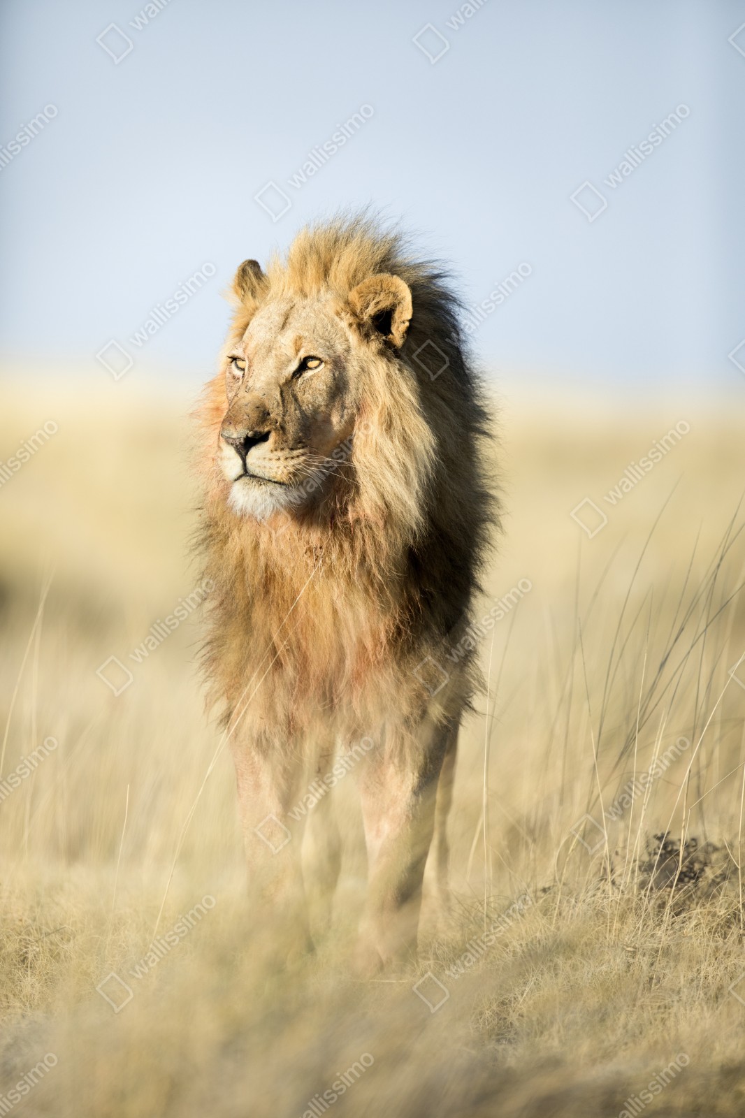 Wprowadź surowe piękno sawanny do wnętrza dzięki temu imponującemu portretowi lwa stojącego w wysokiej trawie.