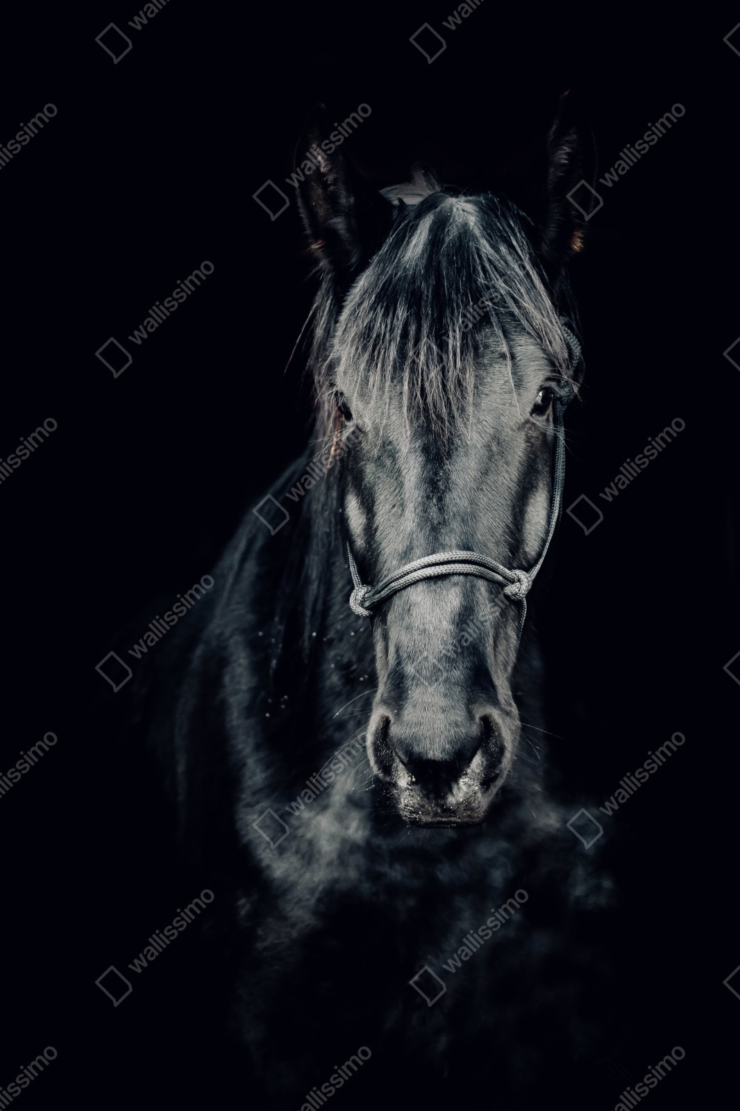 Dodaj wyrazisty akcent do wnętrza dzięki temu dramatycznemu portretowi czarnego konia, uchwyconemu w głębokim kontraście i nastrojowych tonach.