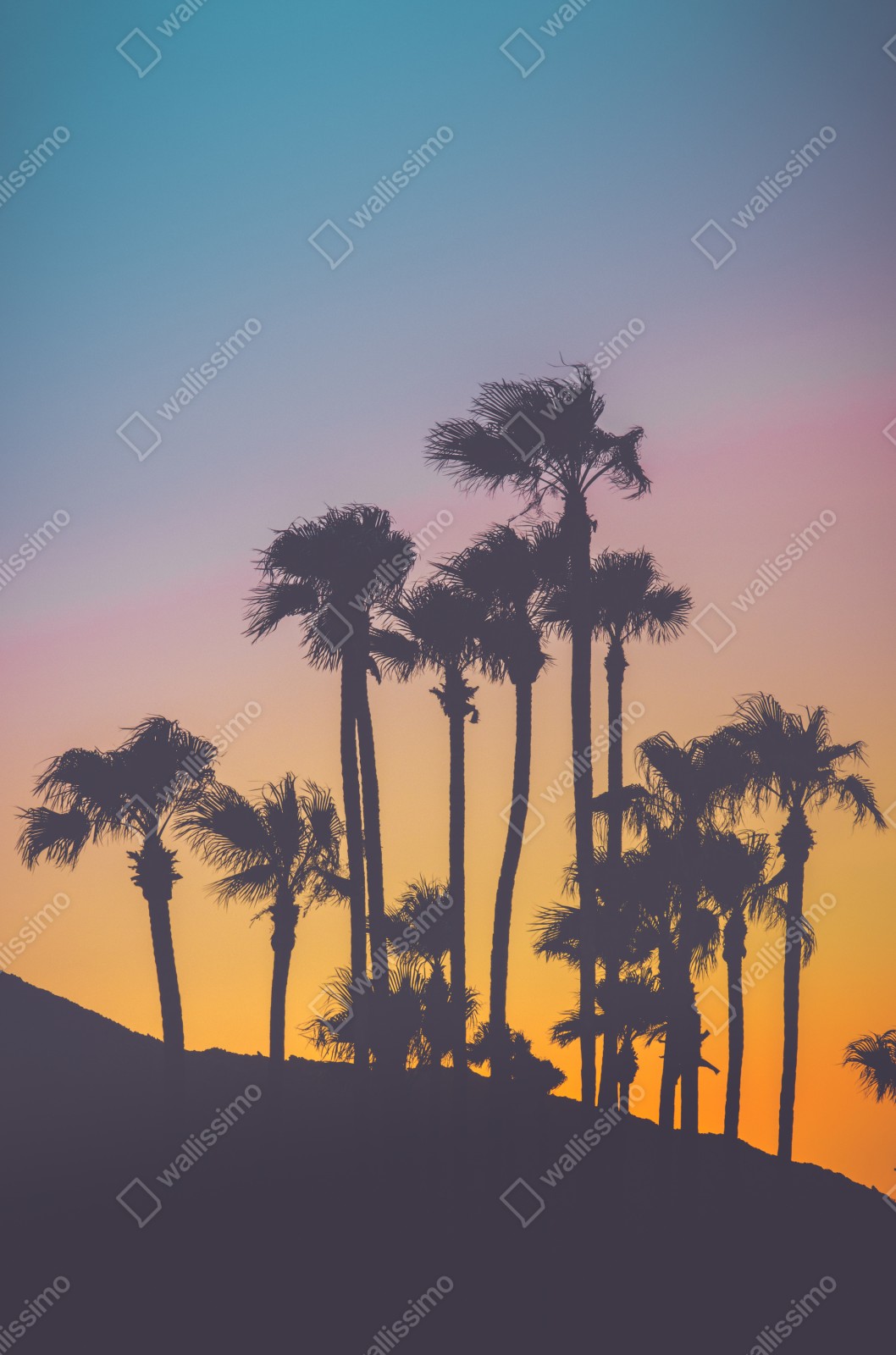 Dodaj relaksujący, tropikalny klimat dzięki retro-filtrowanym sylwetkom palm na tle żywego zachodu słońca, idealne do ocieplenia każdego wnętrza.