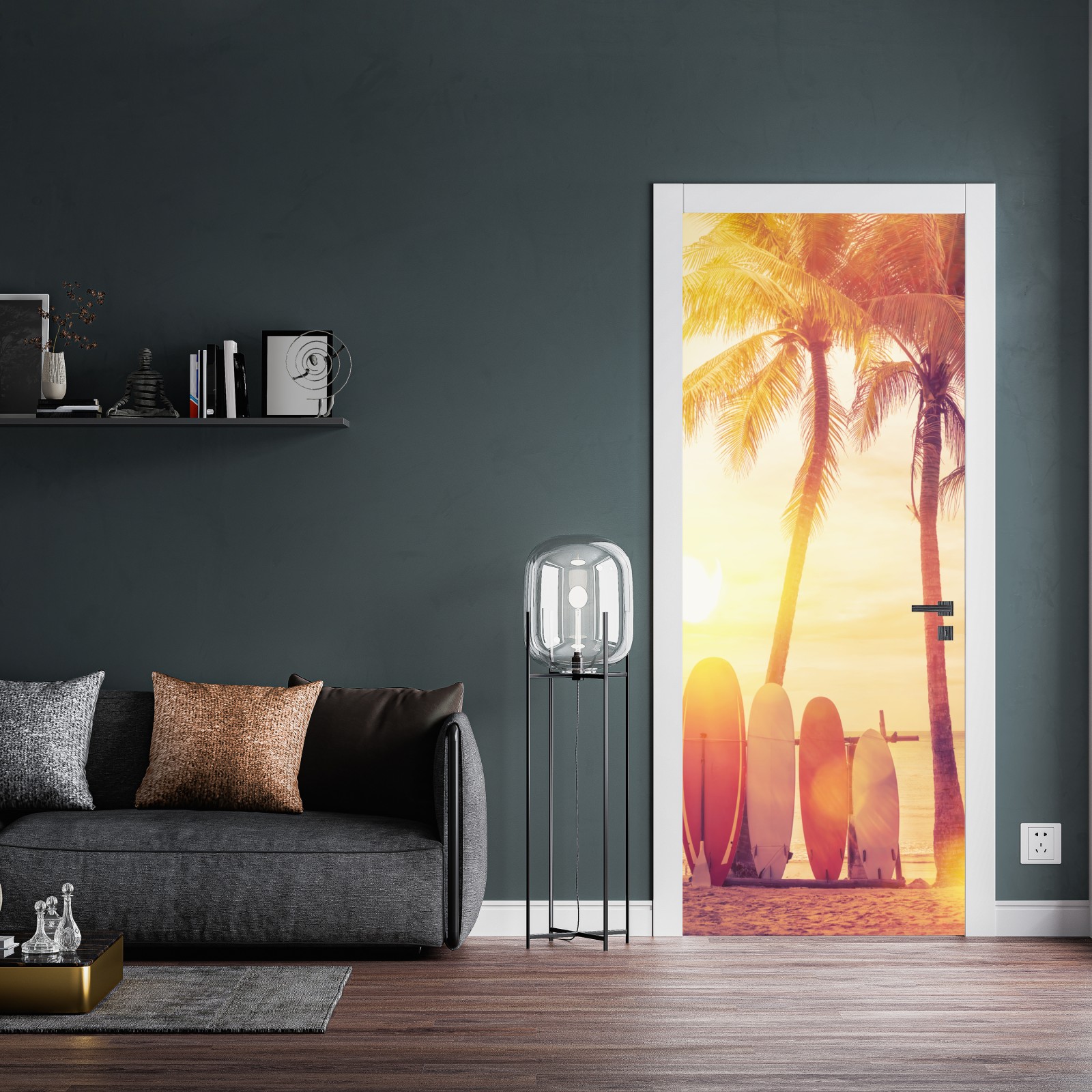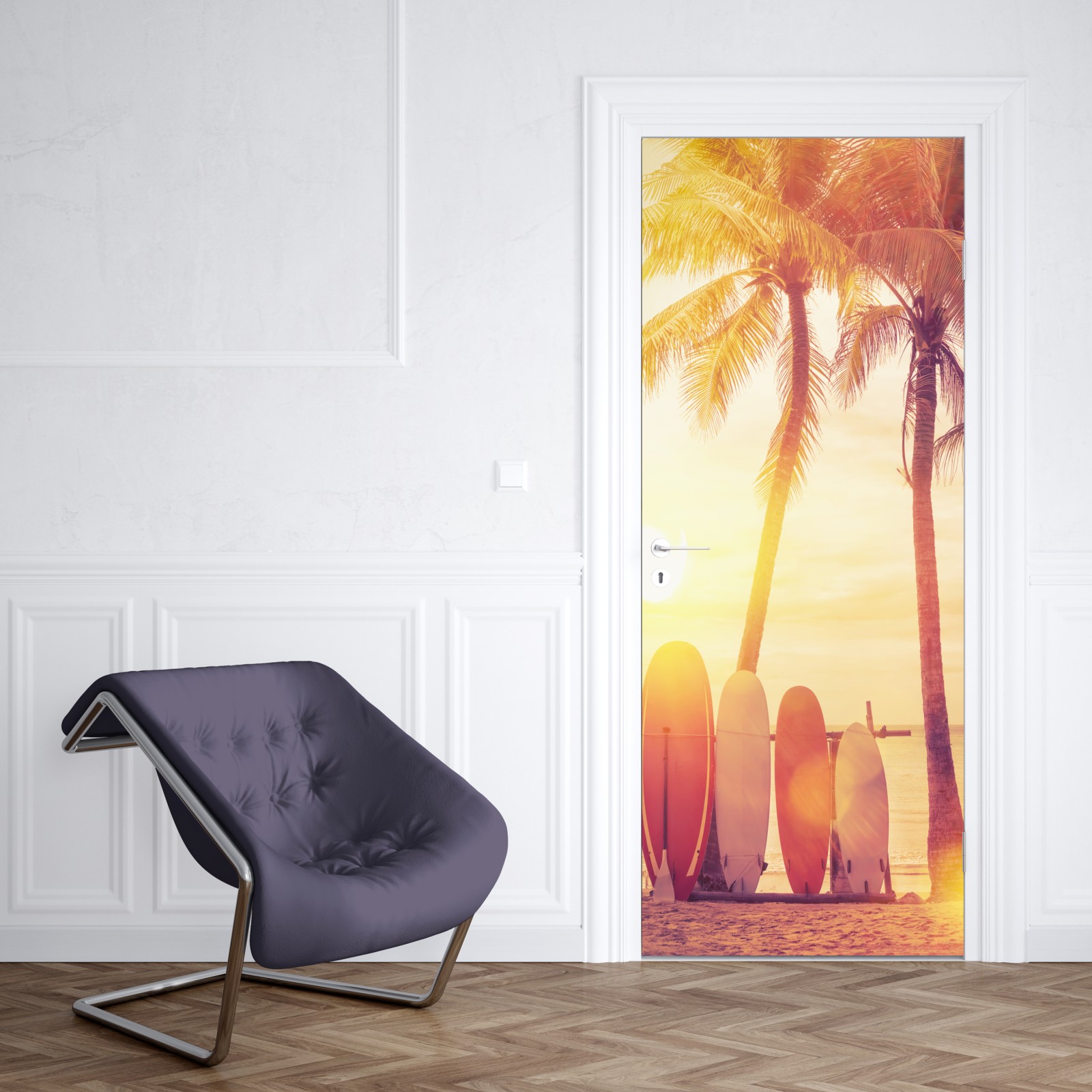 Naklejka na drzwi Tropikalny zachód słońca z deskami surfingowymi