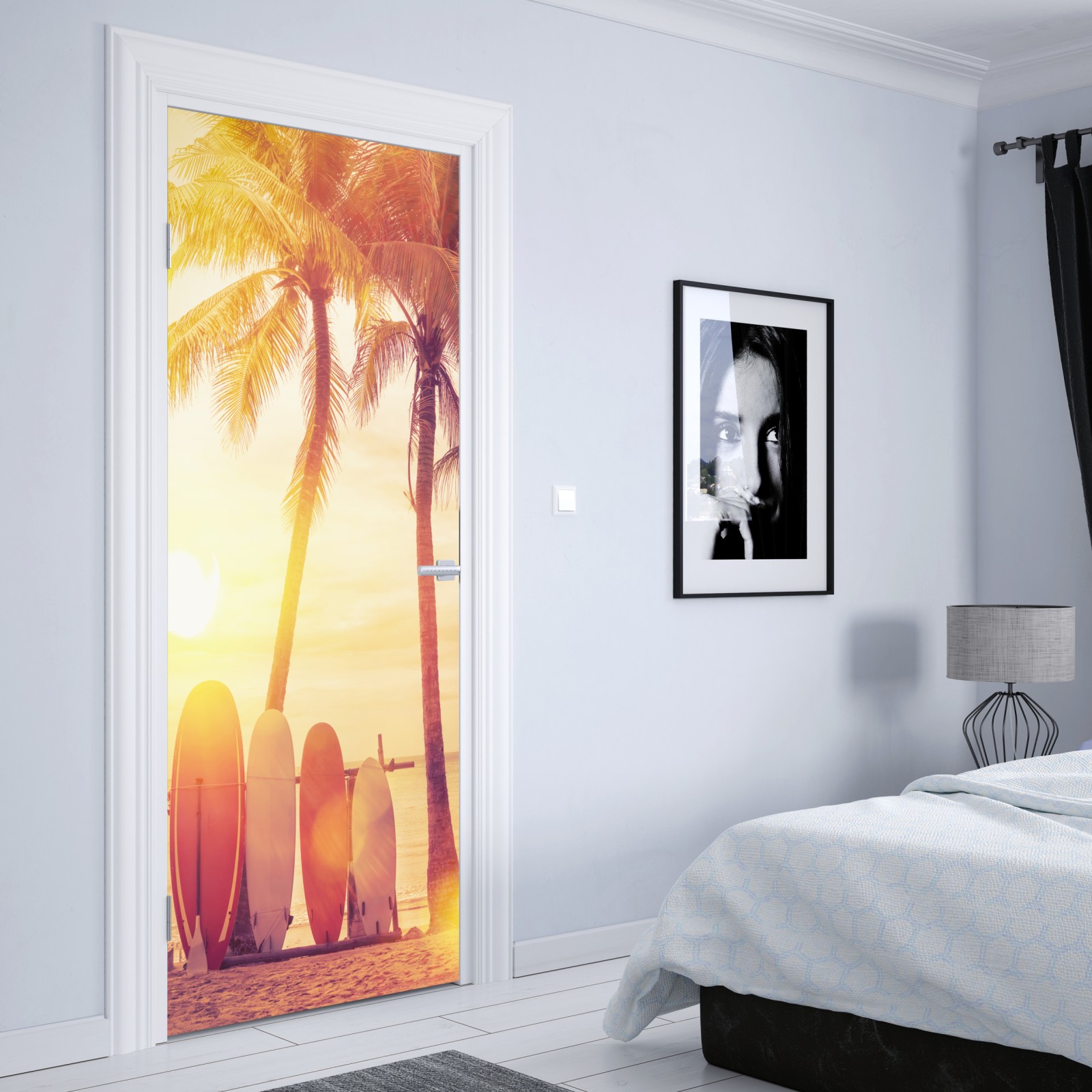 Przenieś wakacyjny klimat tropikalnej plaży z deskami surfingowymi pod palmami, ciepły i marzycielski motyw, który ociepli każde wnętrze.