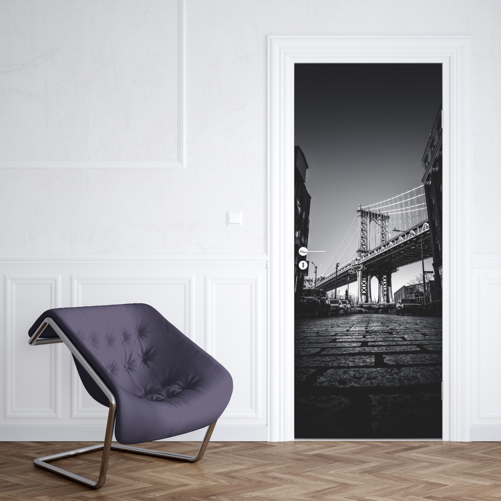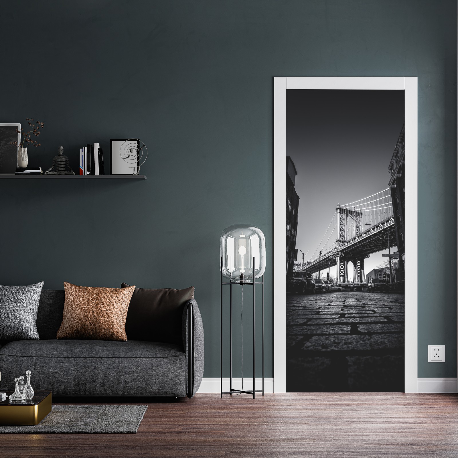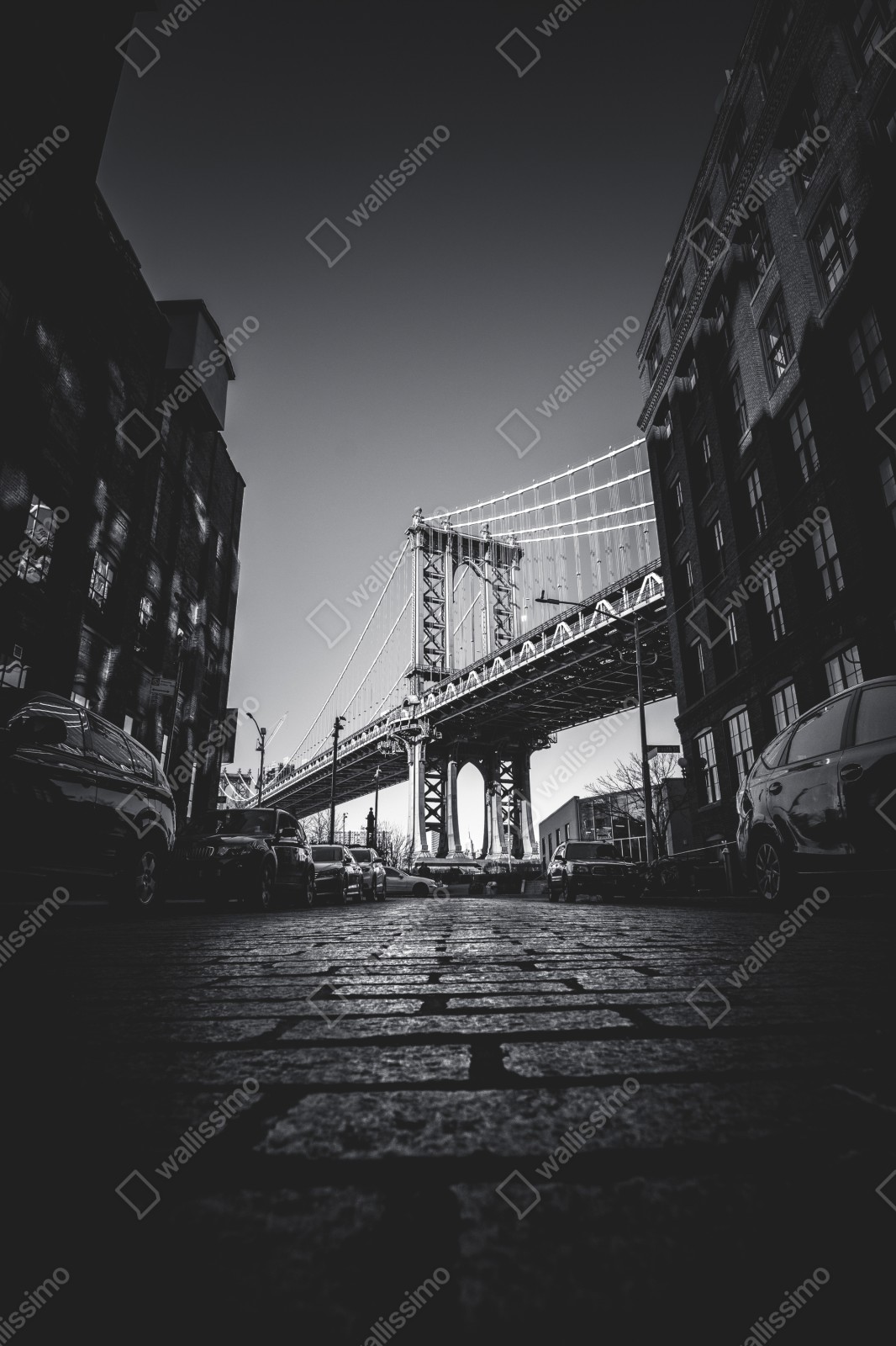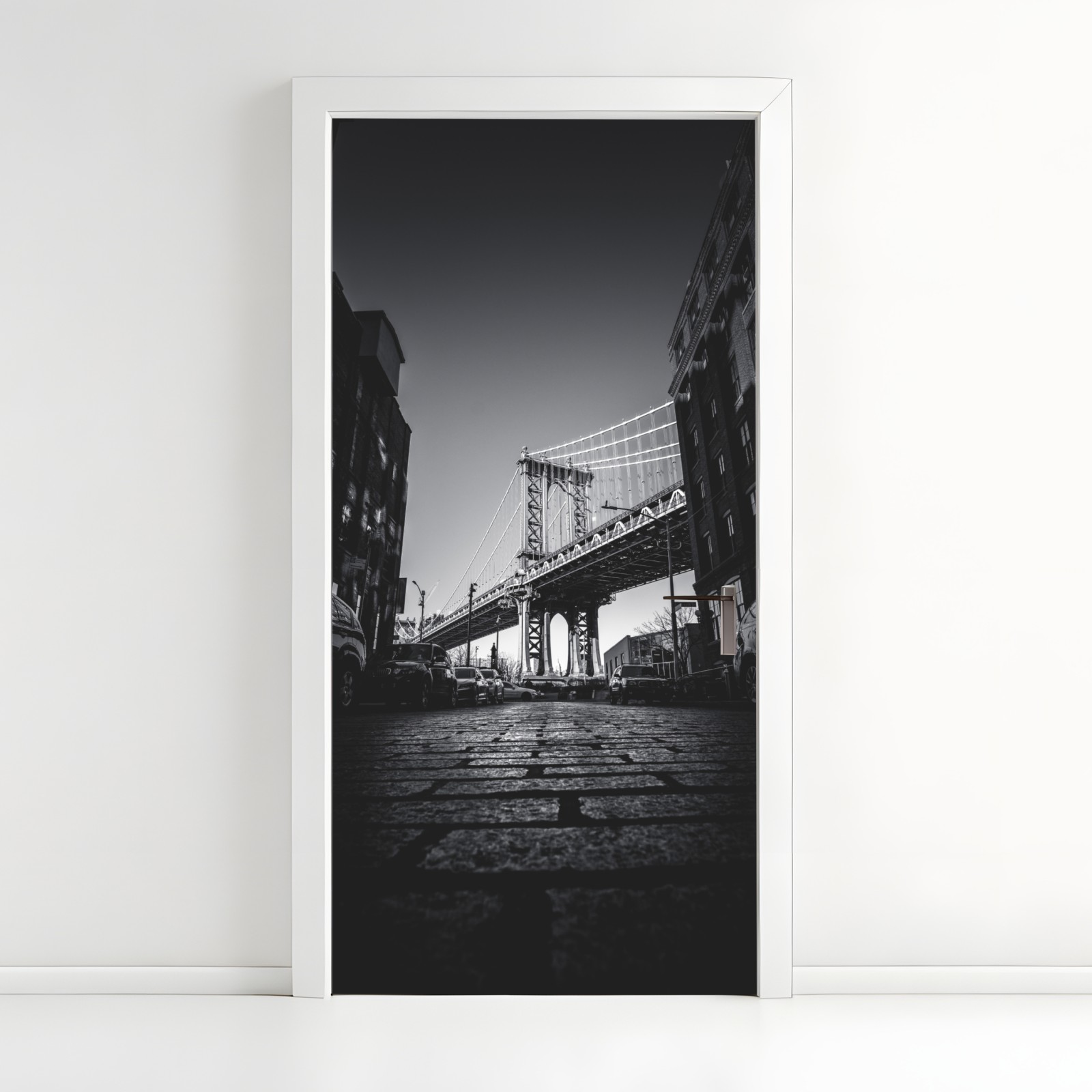 Wprowadź surową miejską energię do wnętrza dzięki dramatycznemu czarno-białemu widokowi na most na Manhattanie, otoczony brukowaną ulicą i przemysłową architekturą.