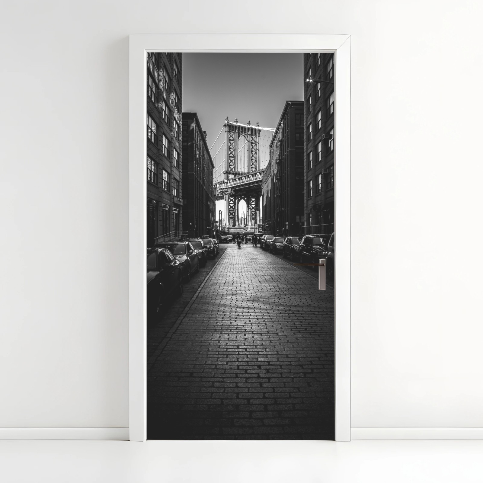 Naklejka na drzwi Most Manhattan w kadrze brukowanej ulicy