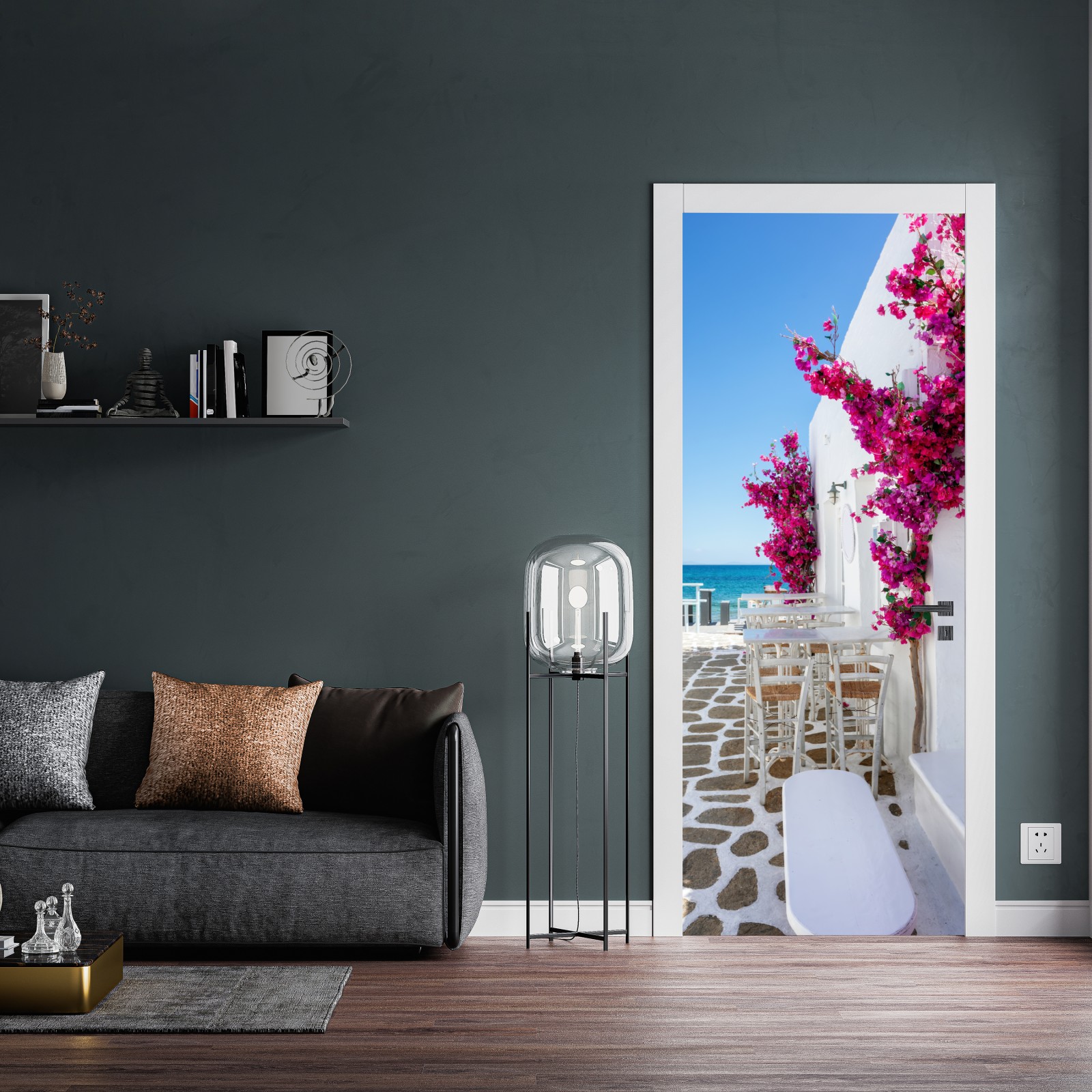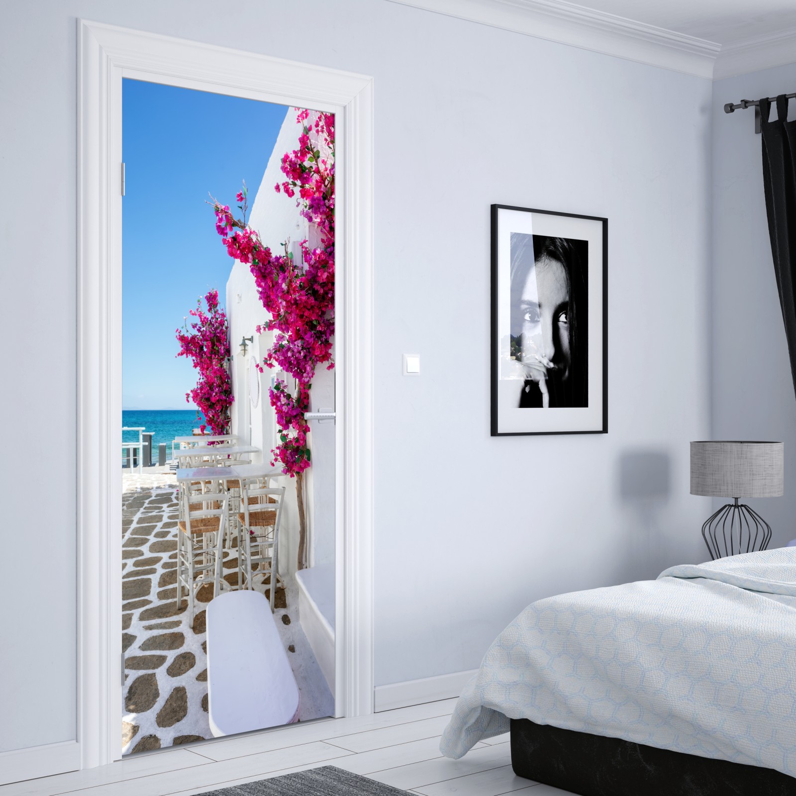 Wprowadź do wnętrza uroczą atmosferę słonecznej śródziemnomorskiej uliczki z intensywną bugenwillą i białymi murami.