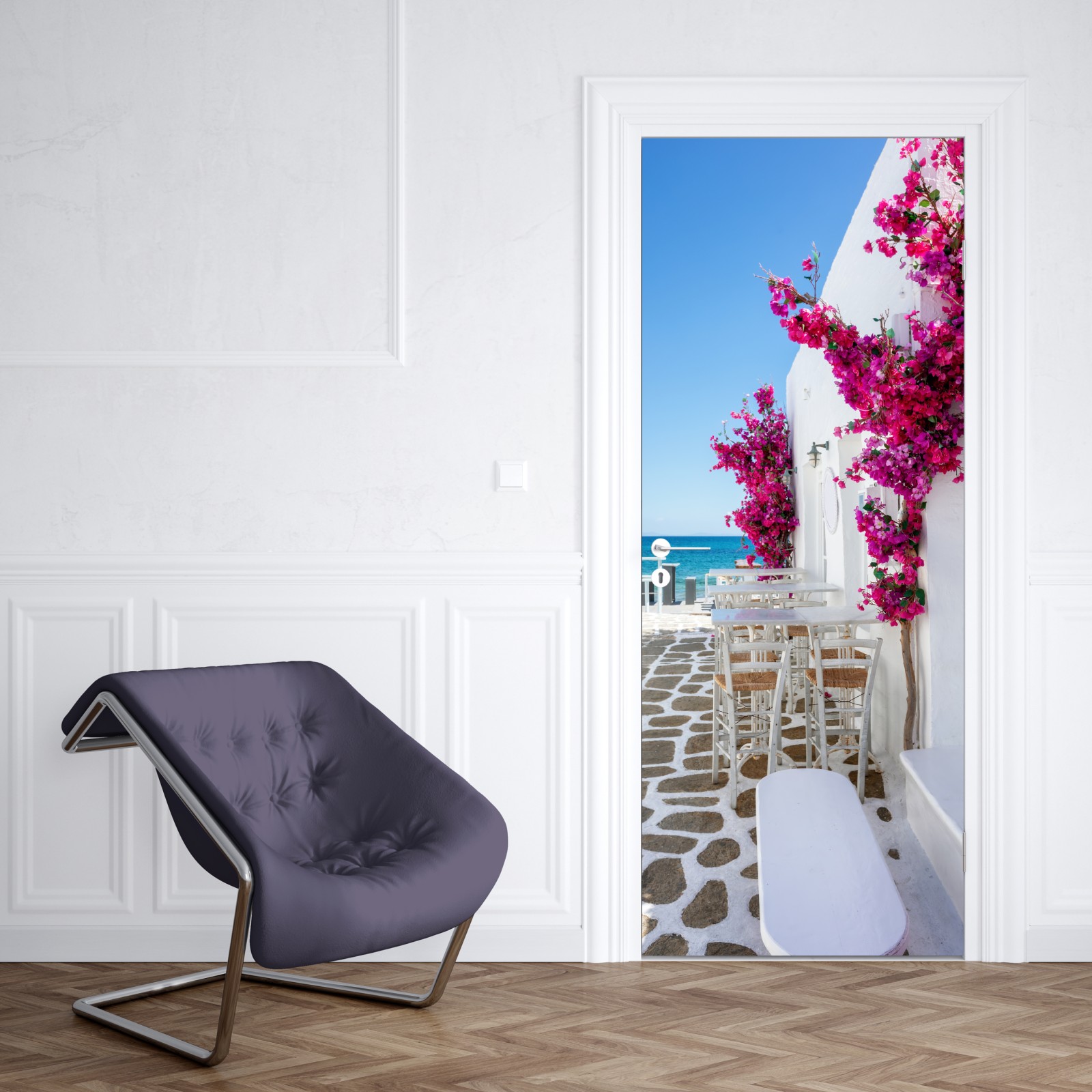 Naklejka na drzwi Słoneczna śródziemnomorska alejka z bugenwillą