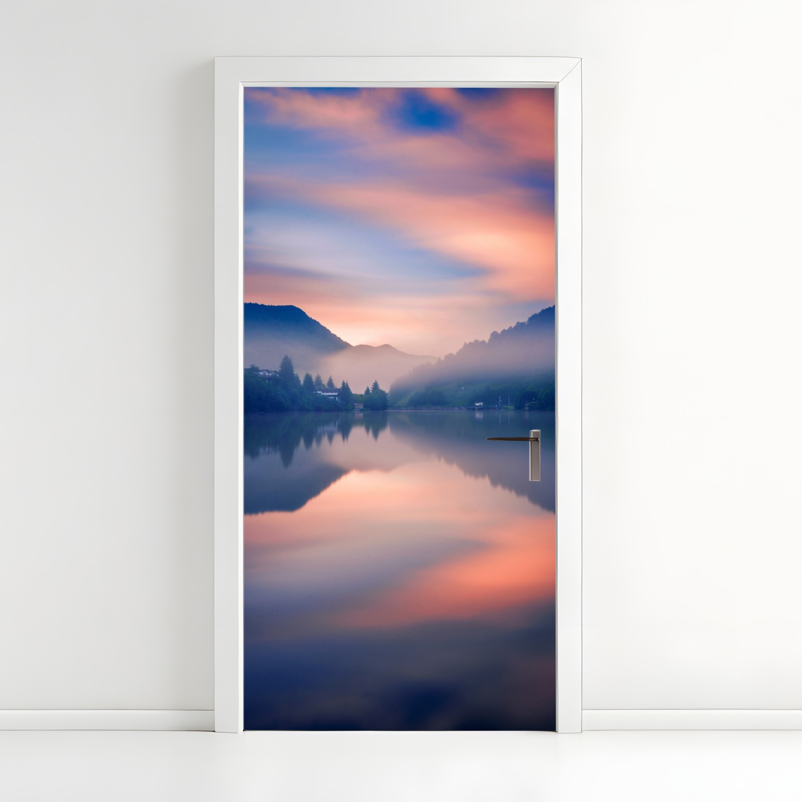 Naklejka na drzwi Mglisty górski poranek nad jeziorem
