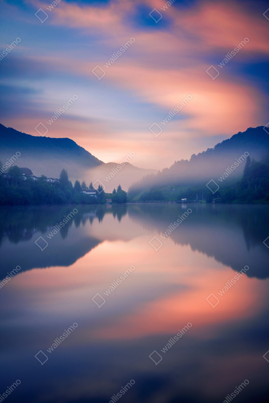 Odkryj uspokajające piękno mglistego górskiego jeziora z pastelowym niebem i lustrzanym odbiciem, idealne do stworzenia wyciszonej atmosfery w pomieszczeniu.