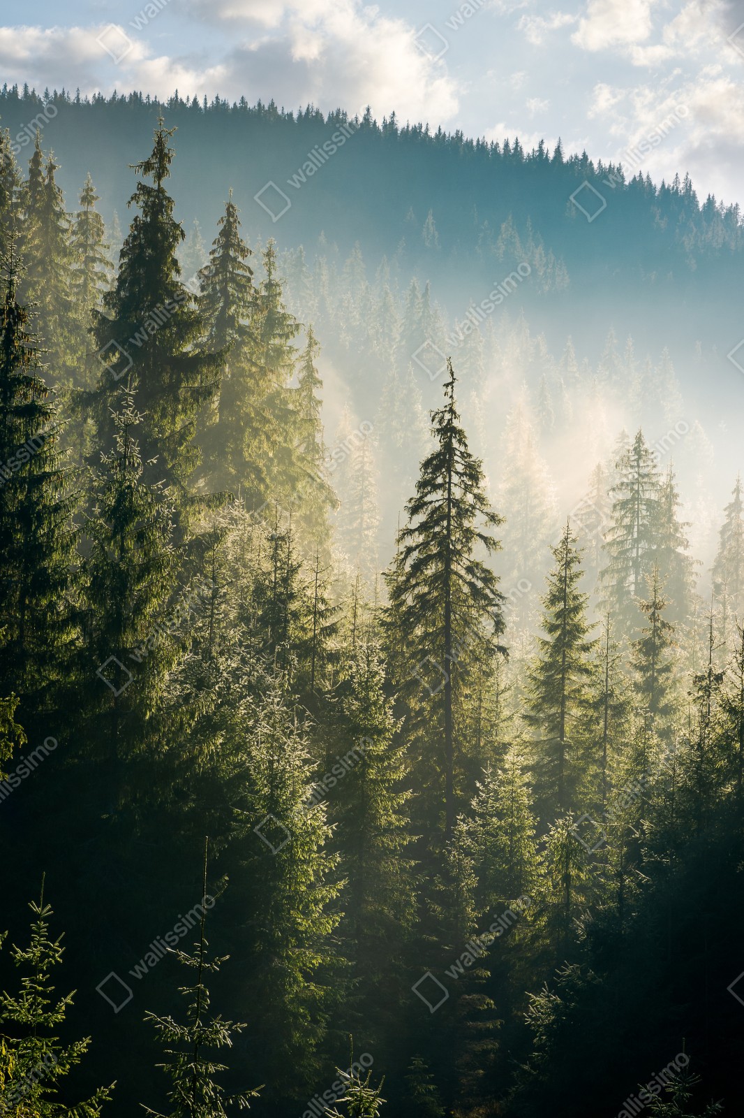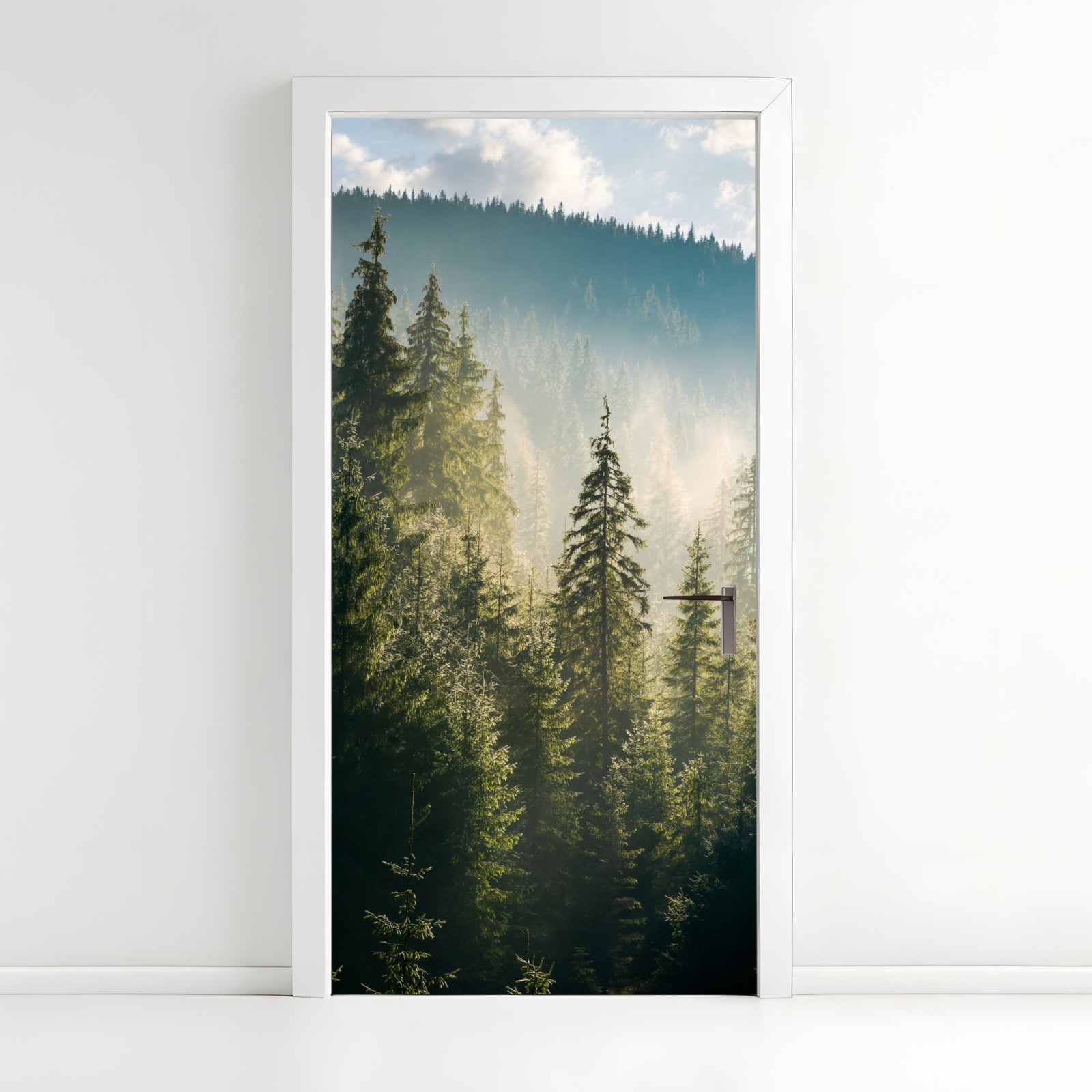 Wprowadź spokój natury do wnętrza dzięki temu mglistemu świerkowemu lasowi w delikatnym porannym świetle.