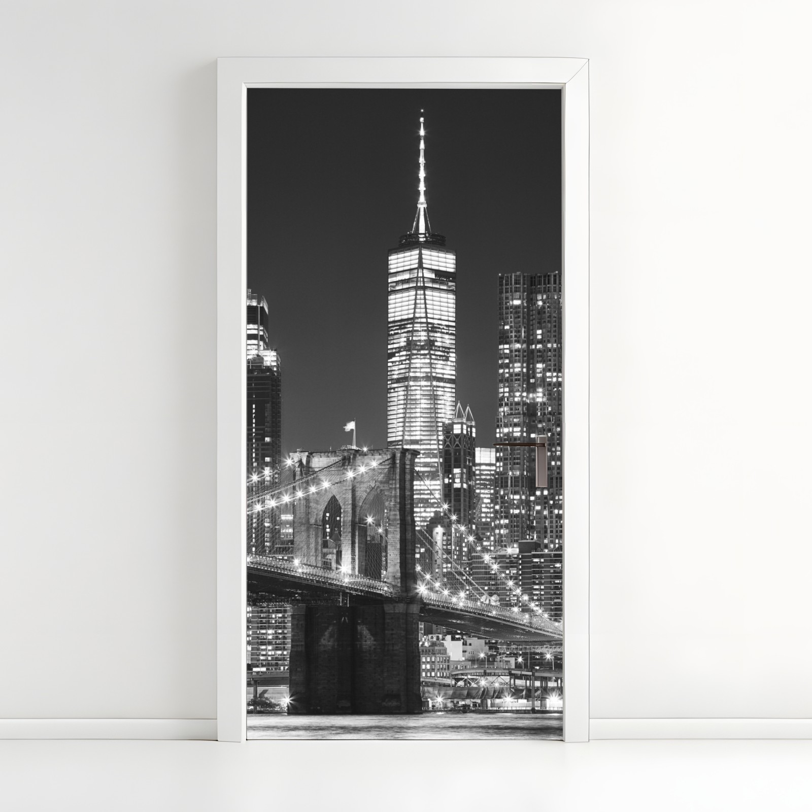 Nadaj wnętrzu dramatyczny miejski charakter dzięki czarno-białemu nocnemu widokowi na Most Brooklyński i Manhattan.