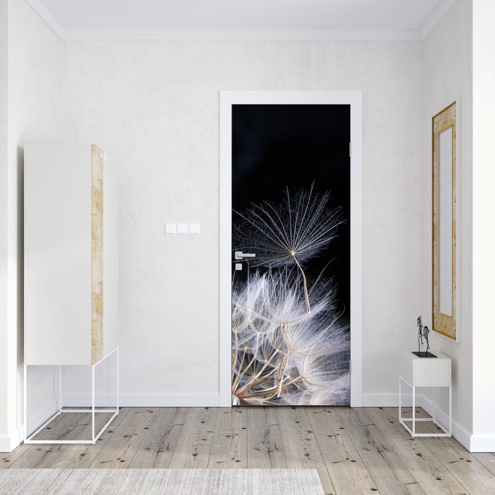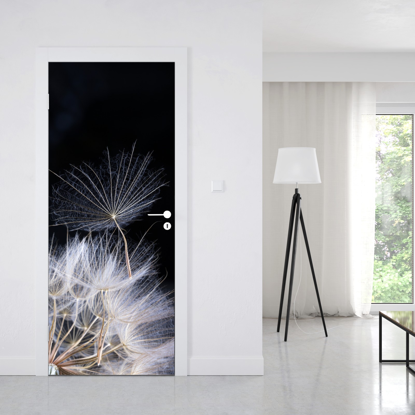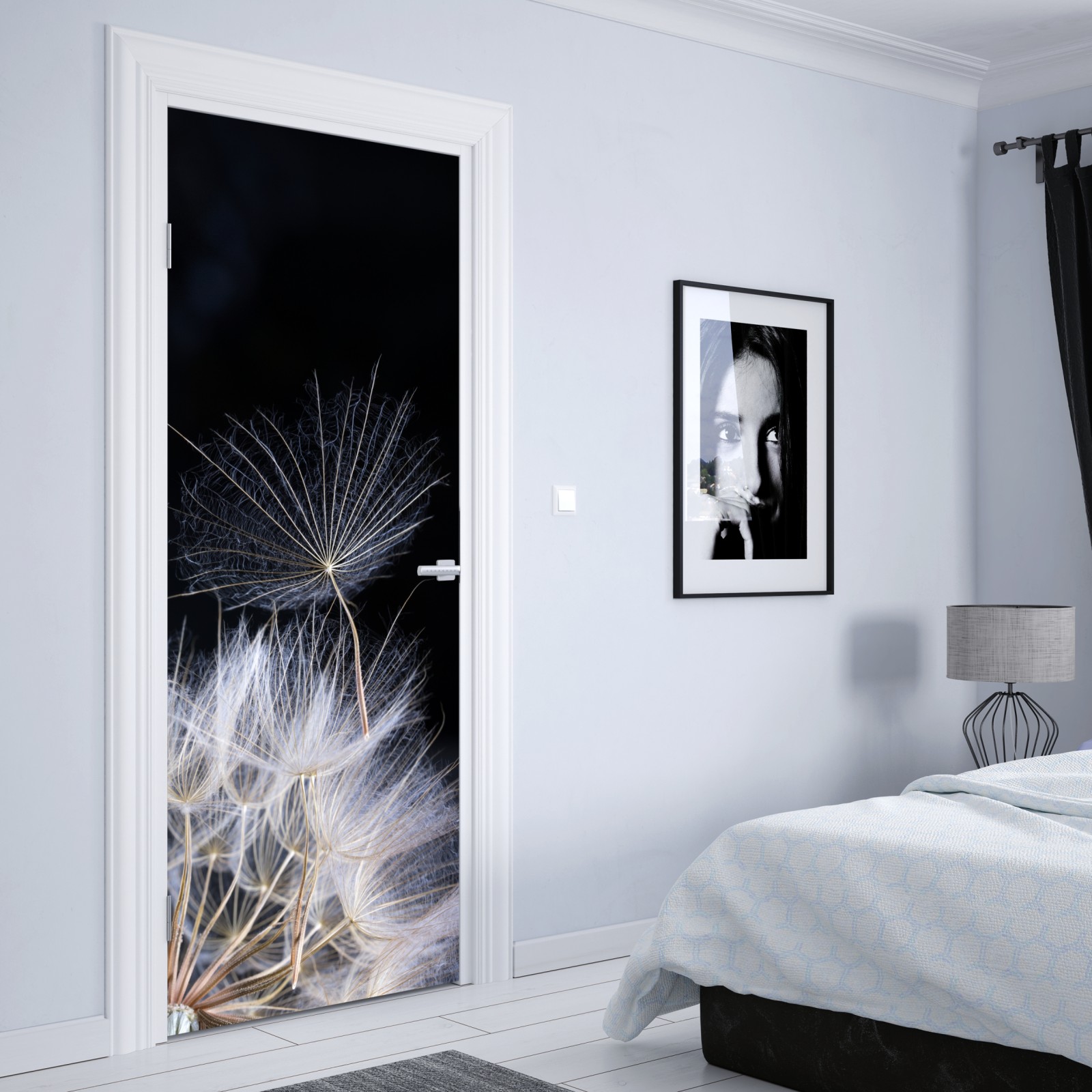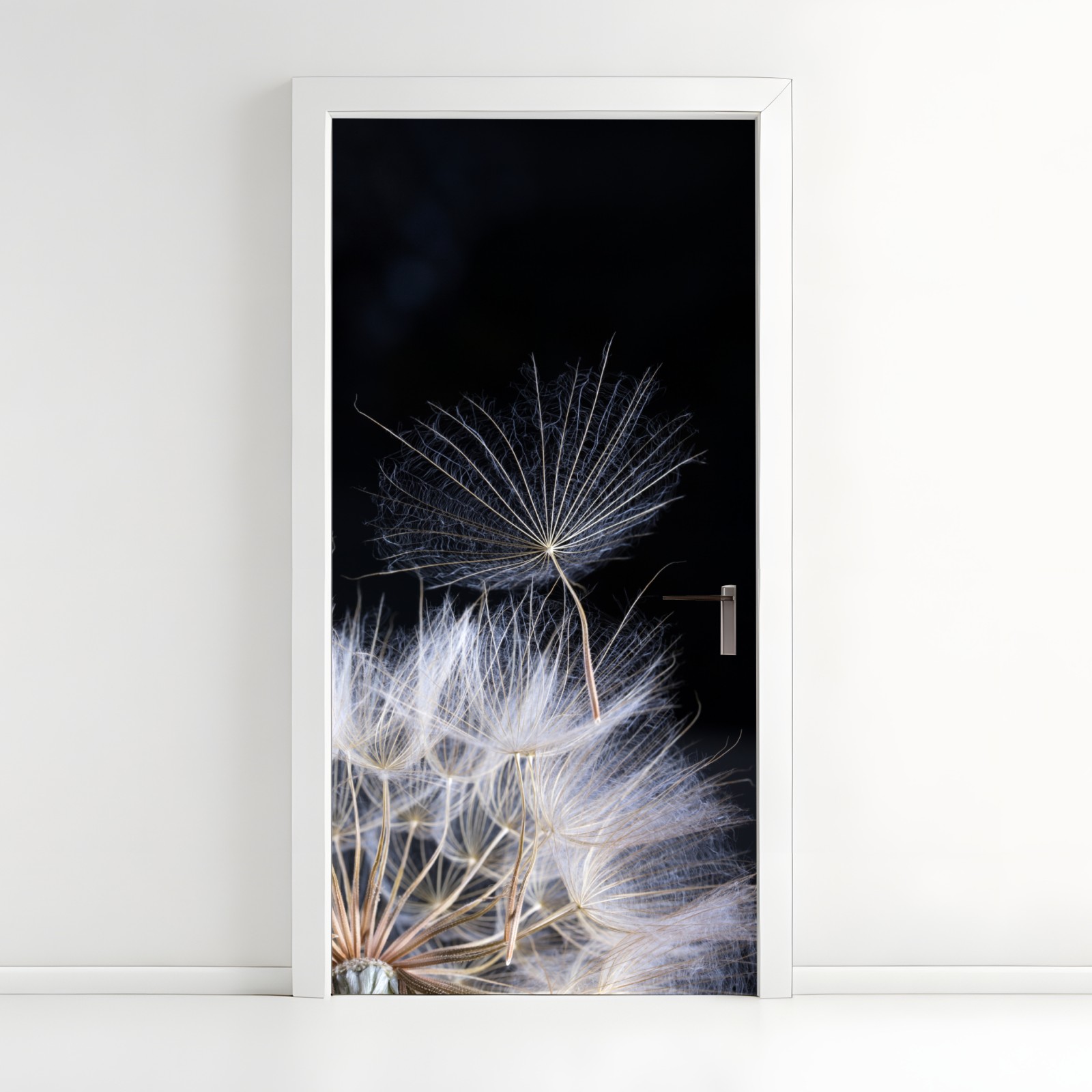 Naklejka na drzwi Delikatne ziarno mniszka na czarnym tle
