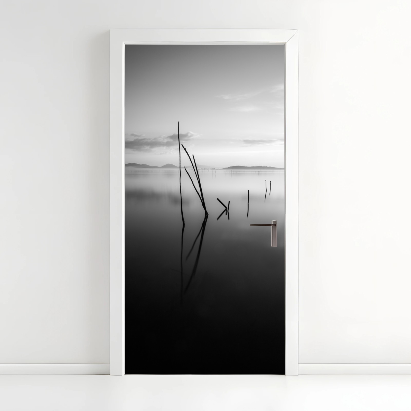 Naklejka na drzwi Spokojne monochromatyczne jezioro z odbiciami