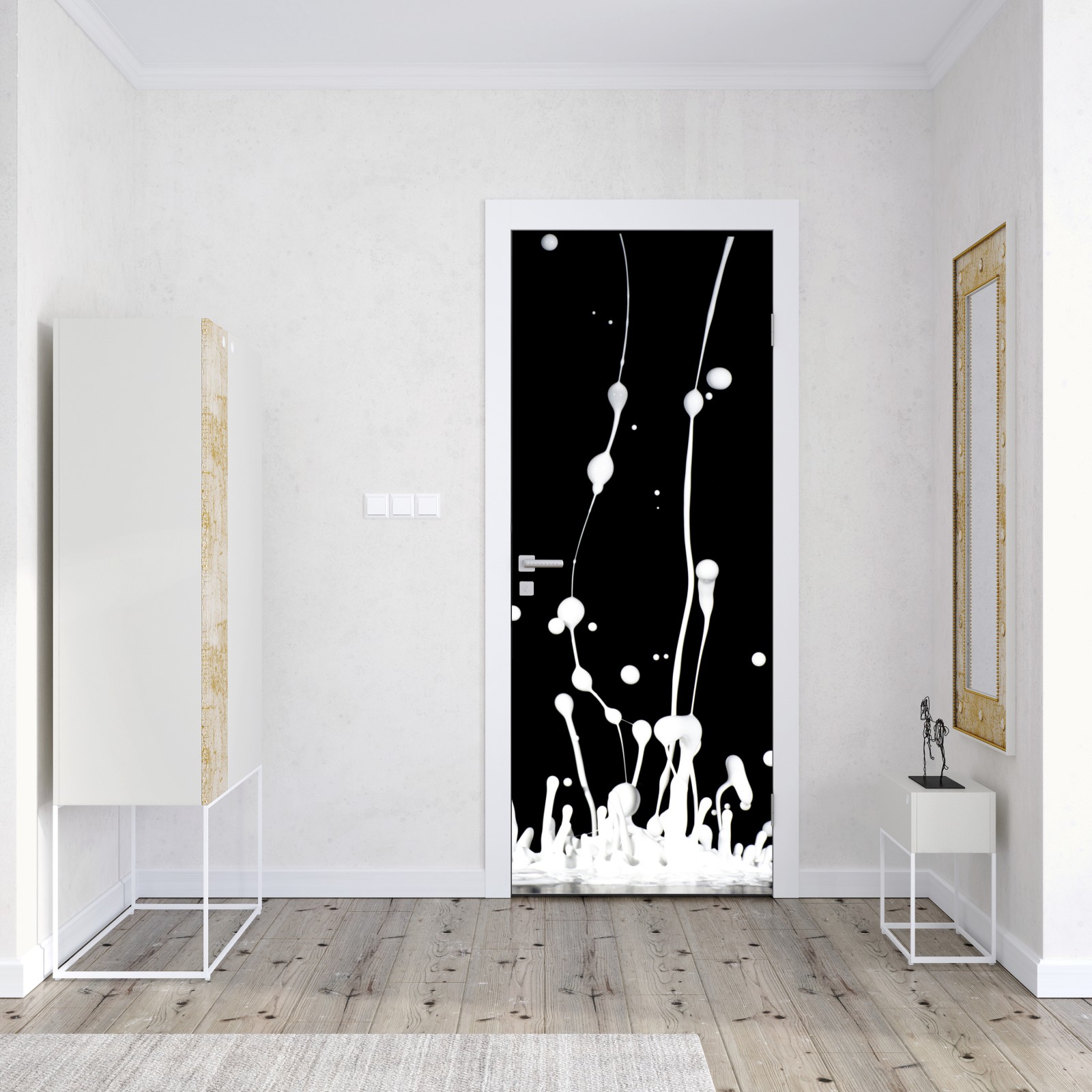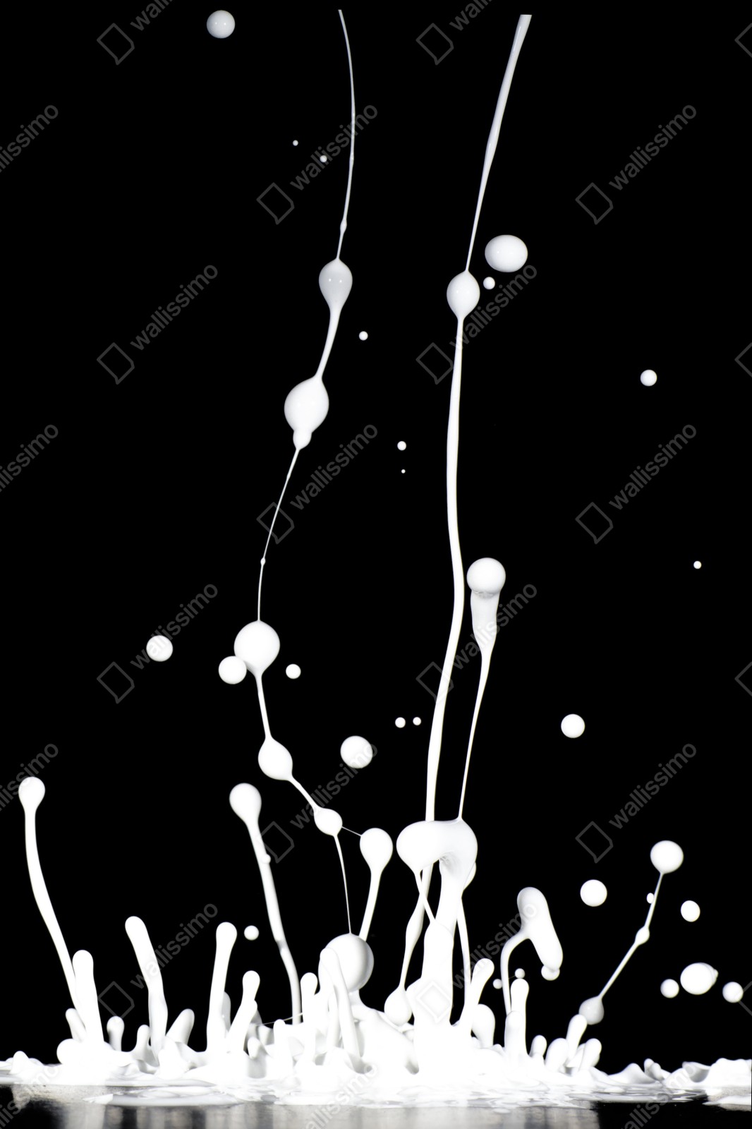 Dynamiczny biały rozprysk na czarnym tle tworzy odważne, minimalistyczne wrażenie w nowoczesnych wnętrzach.