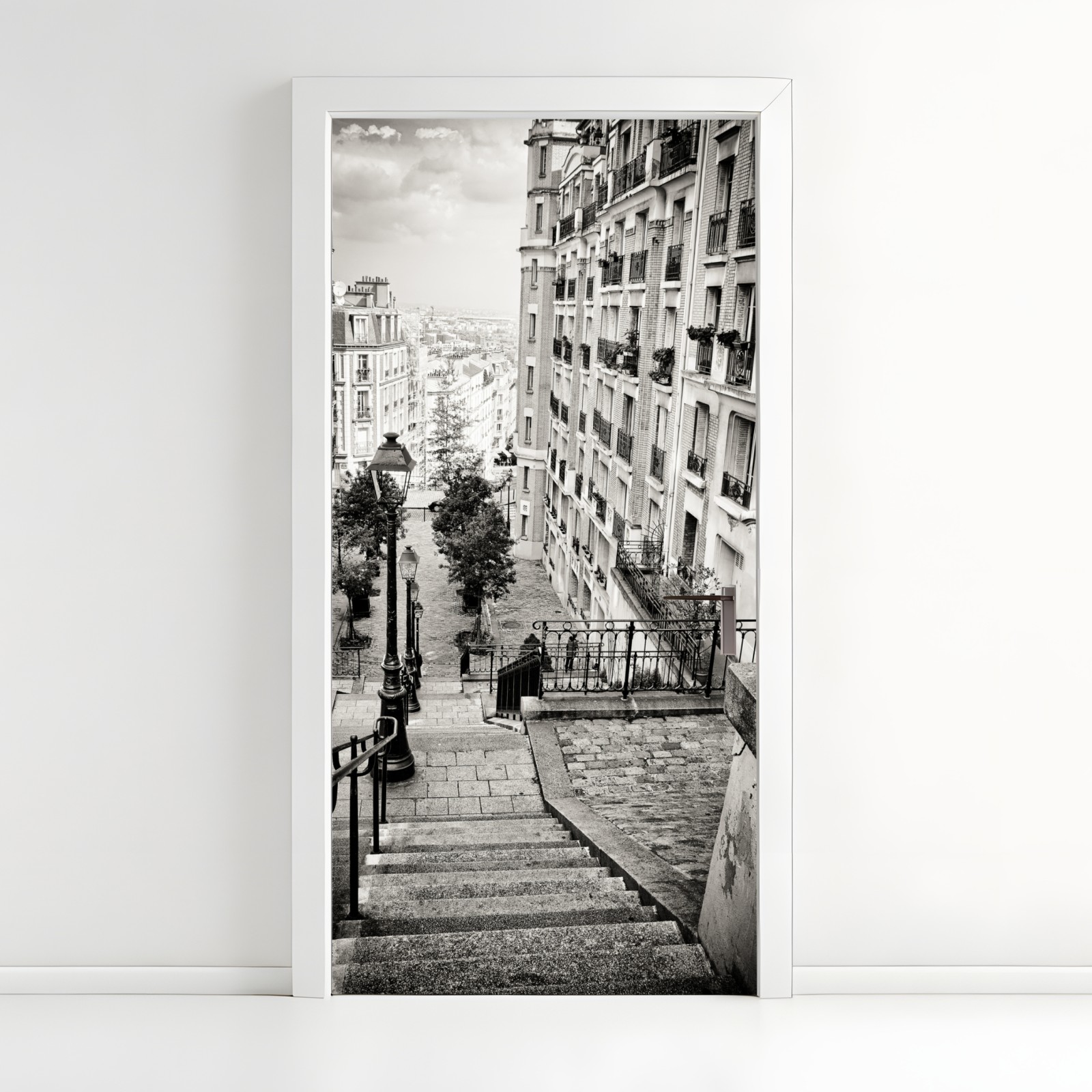 Ożyw swoje wnętrze ponadczasowym czarno-białym widokiem stromych miejskich schodów, emanującym eleganckim urokiem i klasyczną architekturą.